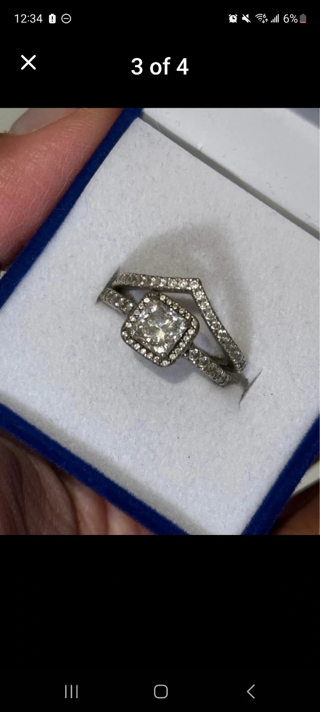This is a beautiful princess cut engagement ring set. The main stone is a square princess cut surrounded by smaller stones. It includes a matching band with pave-style stones.