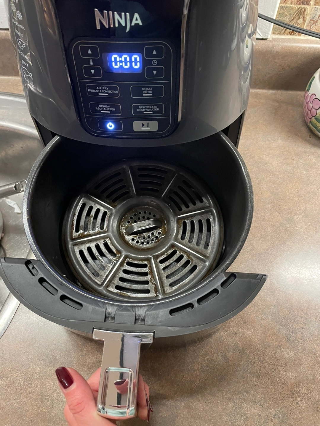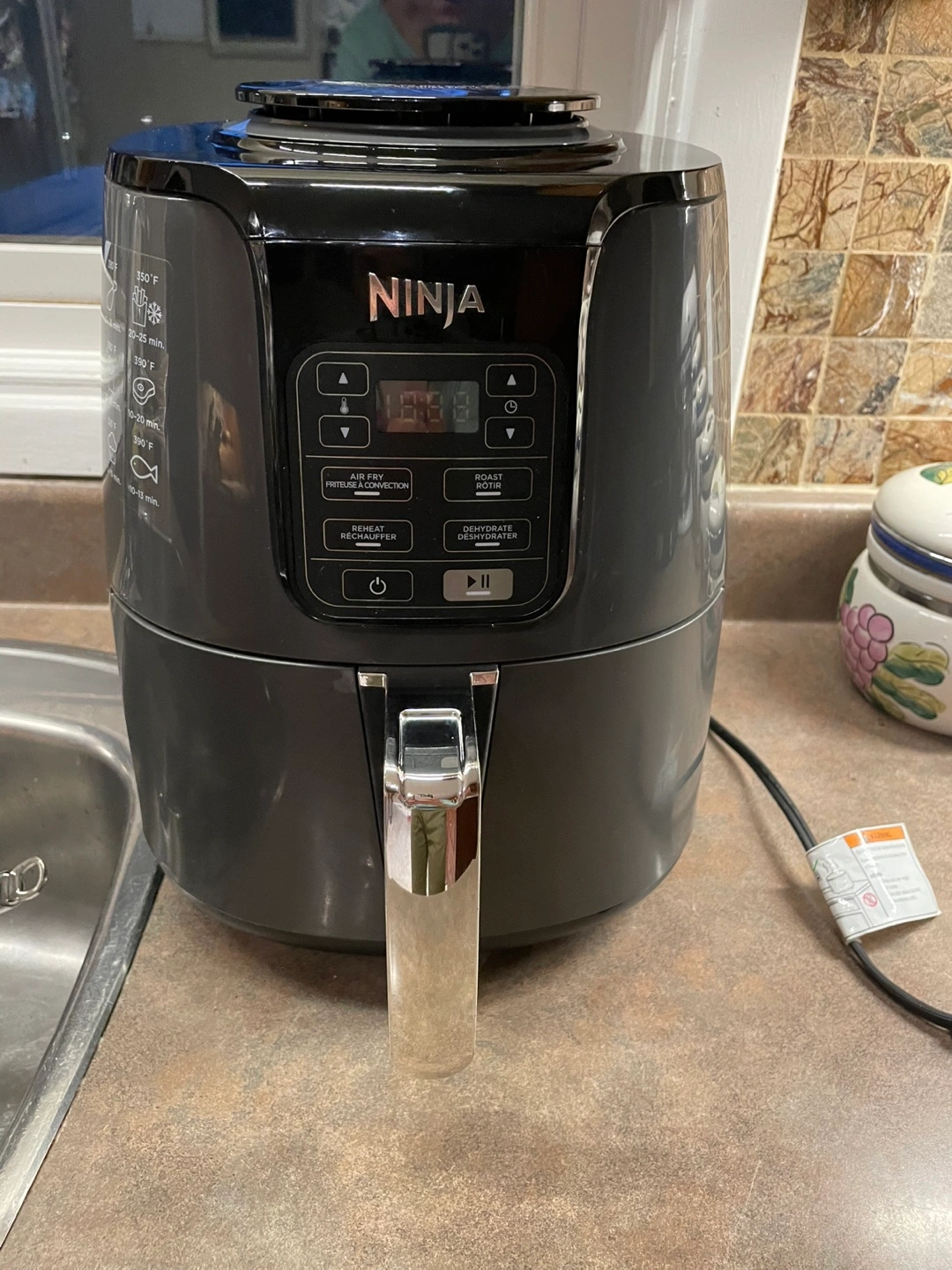 Digital air fryer. Multiple functions: air fry, roast, dehydrate, reheat. Includes removable crisper plate. Good condition.