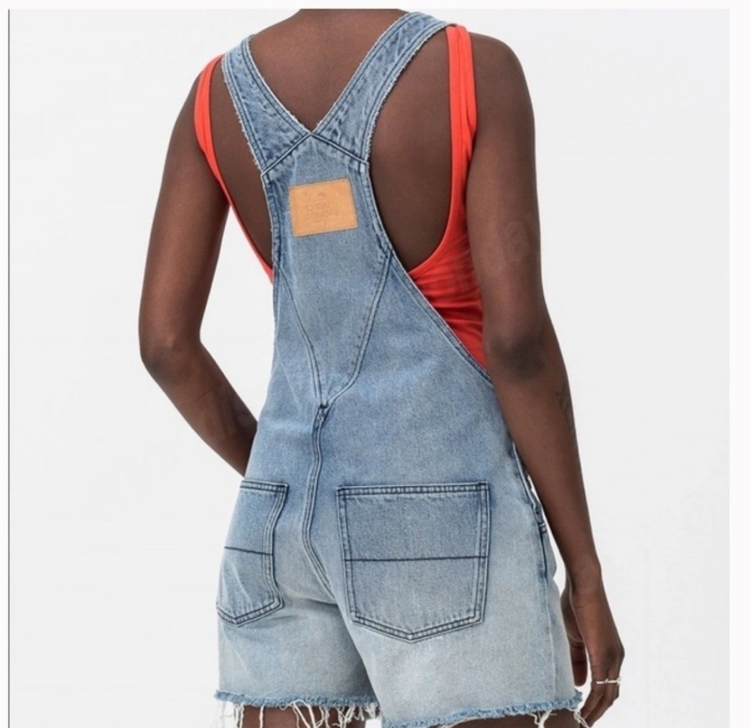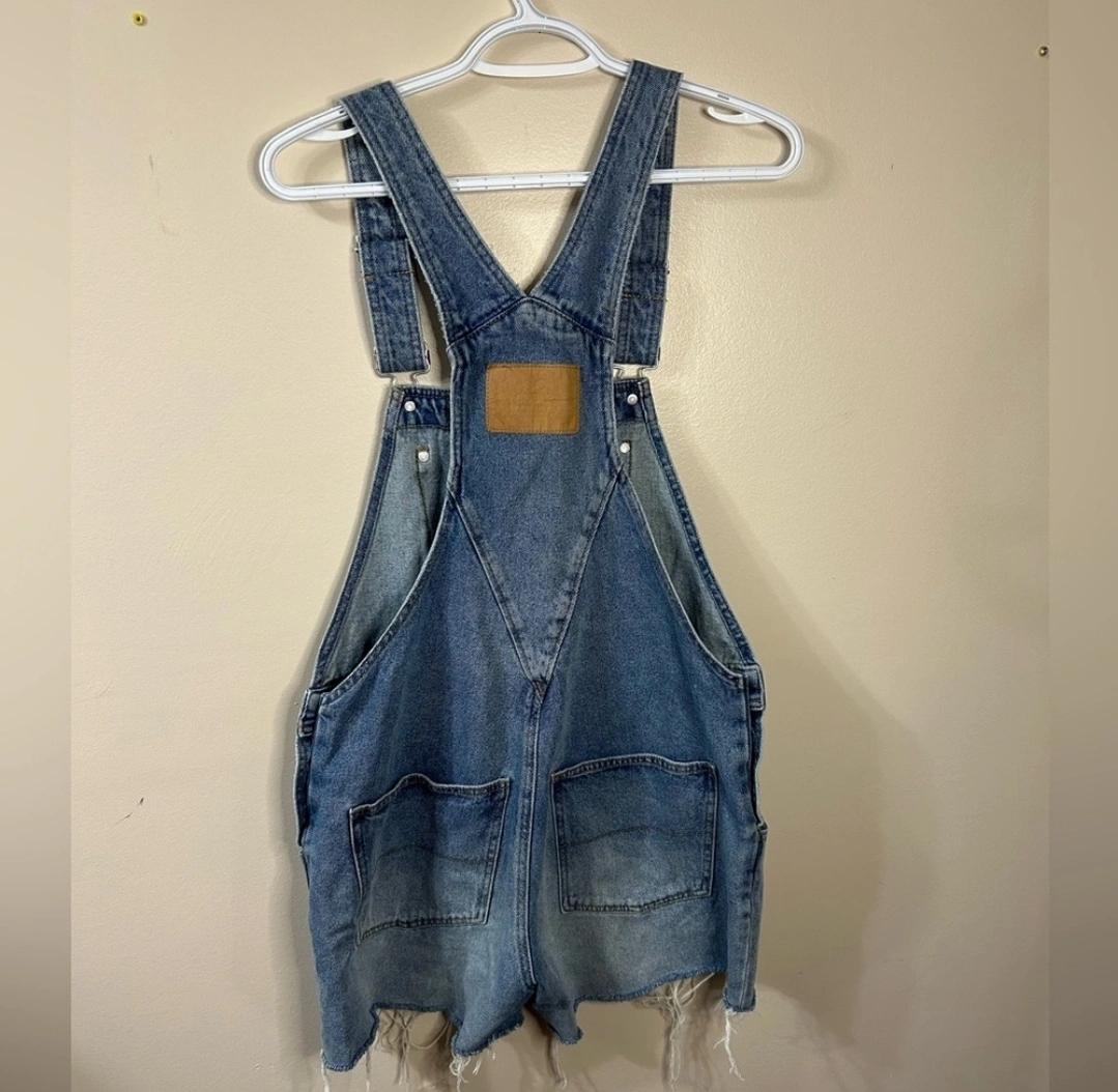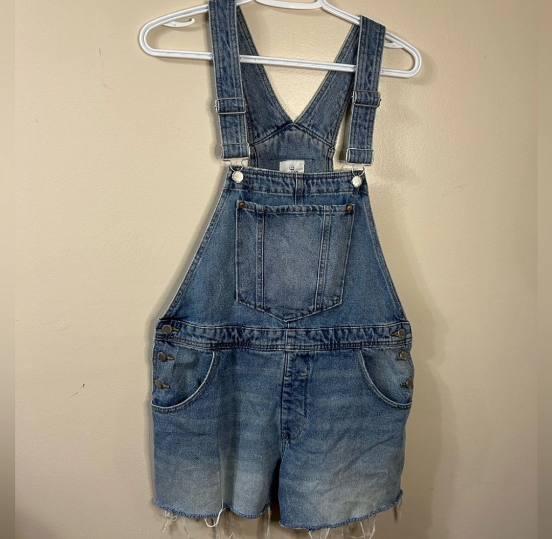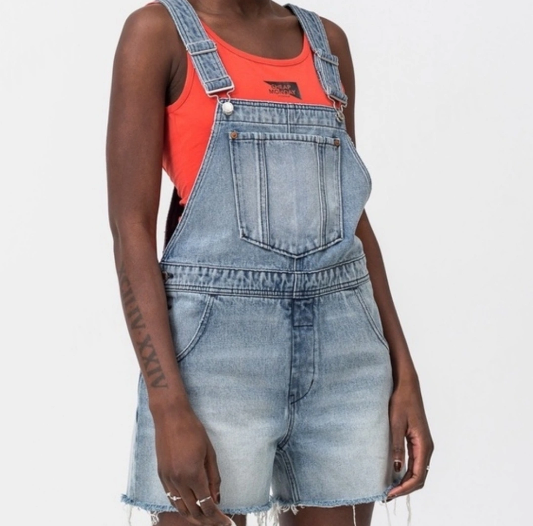 125Light wash denim overalls. Adjustable straps. Multiple pockets. Frayed hems. Short length. excellent condition retails $125