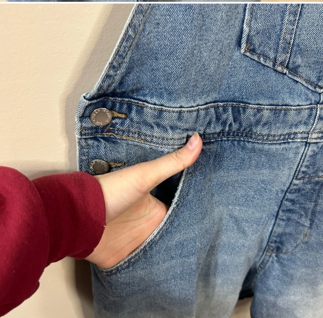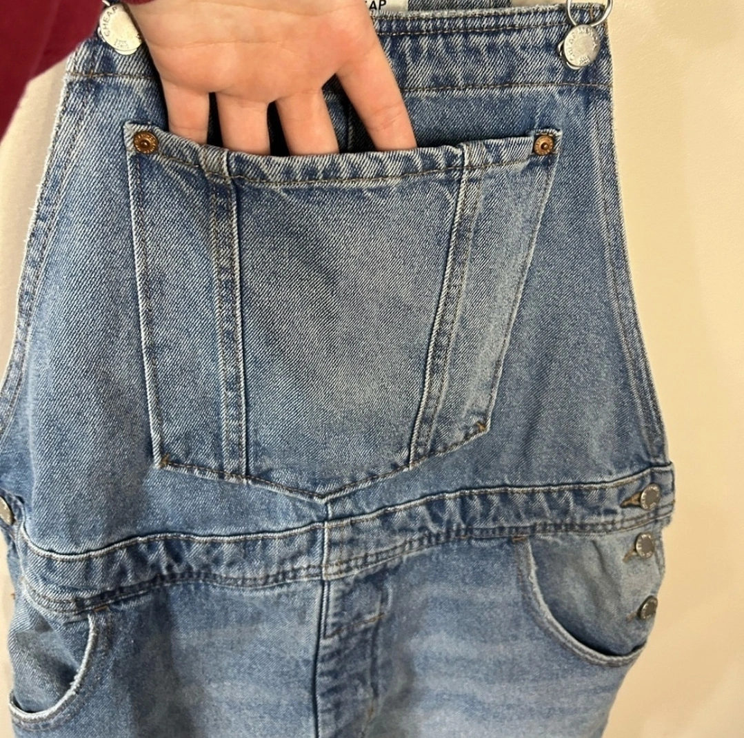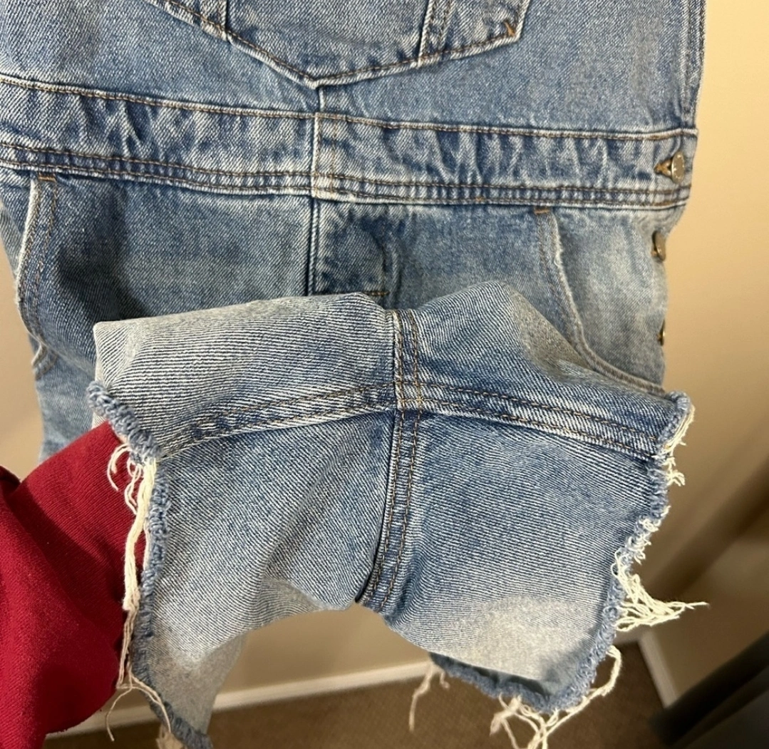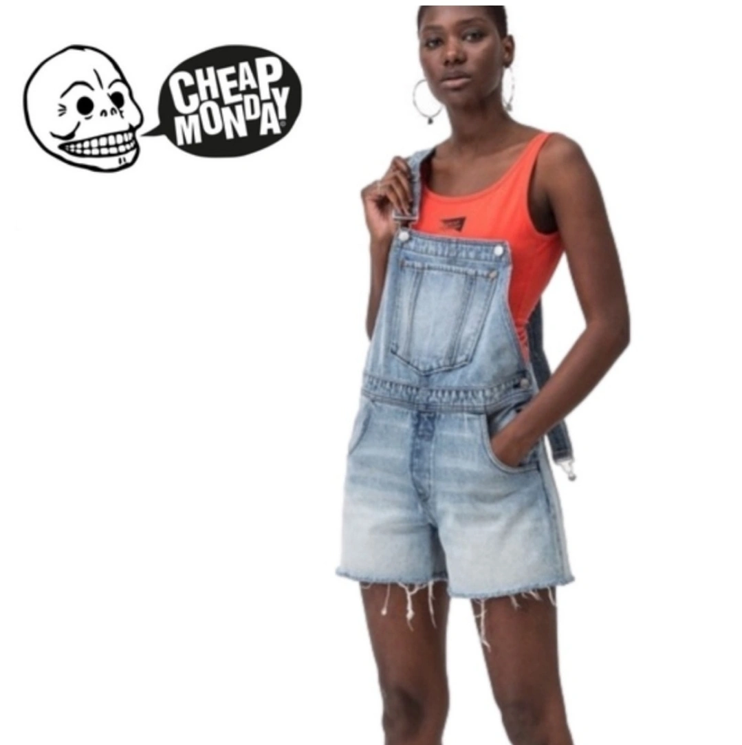 125Light wash denim overalls. Adjustable straps. Multiple pockets. Frayed hems. Short length. excellent condition retails $125