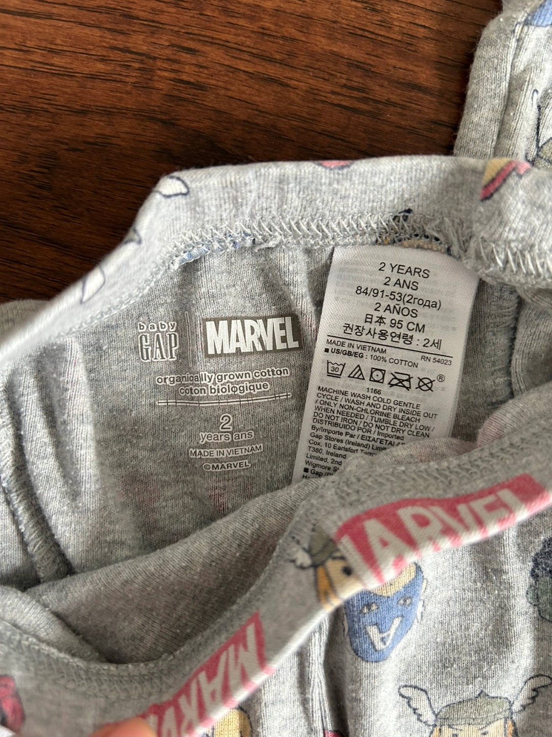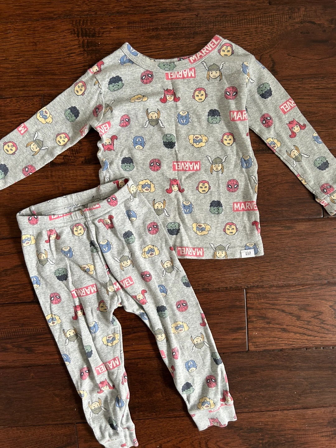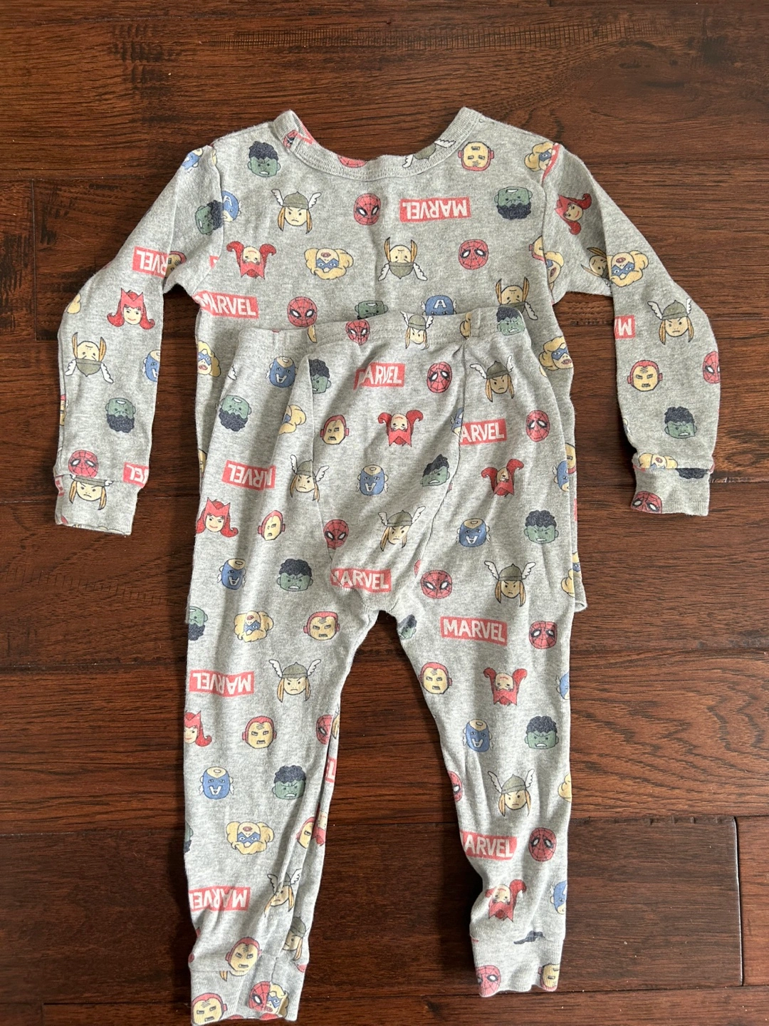 Adorable grey Marvel pajamas set with a long-sleeved top and bottom. Features a pattern of various Marvel characters. Soft and comfy! Size 2 years. Great condition!