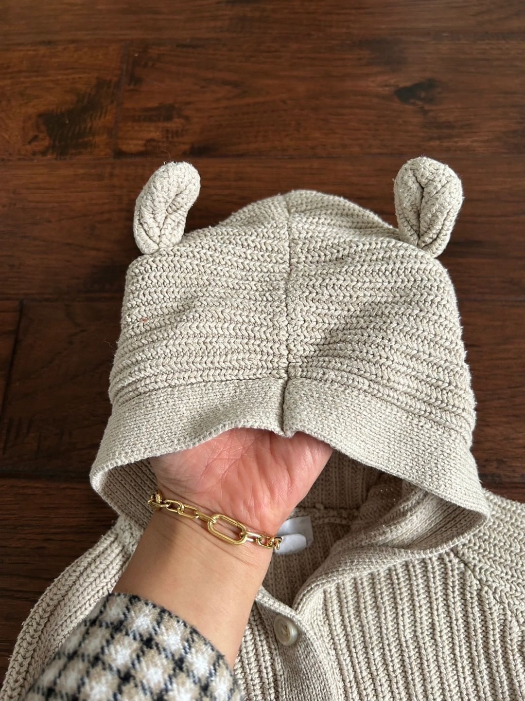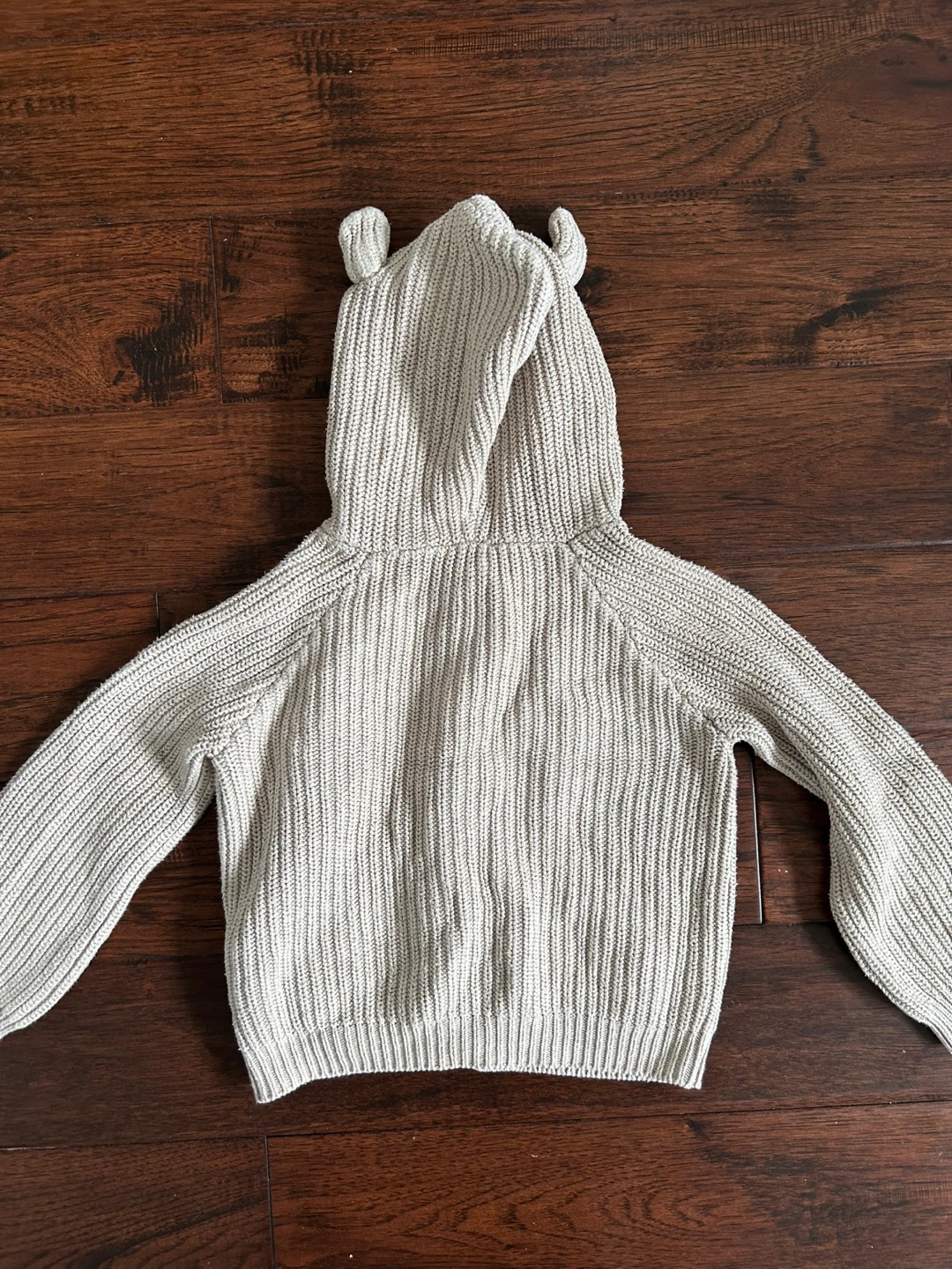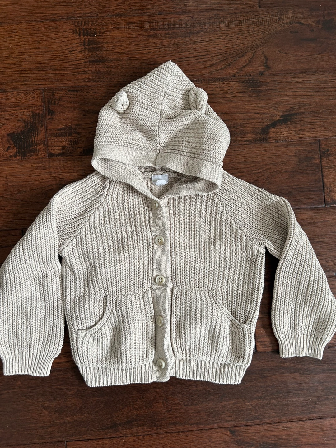 Adorable beige knit cardigan. Size 2Y. Features a cute hooded design with bear ears. Button closure. Two front pockets.