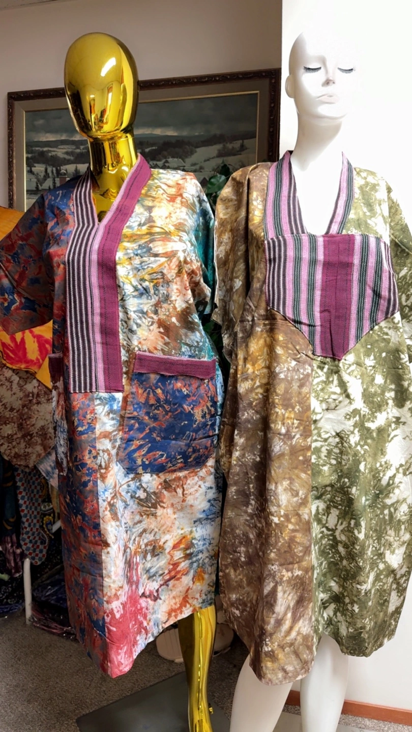 Two beautiful, colourful maxi dresses. Tie-dye pattern. Short sleeves. V-neck. Unique design elements. Relaxed fit. Perfect for summer.