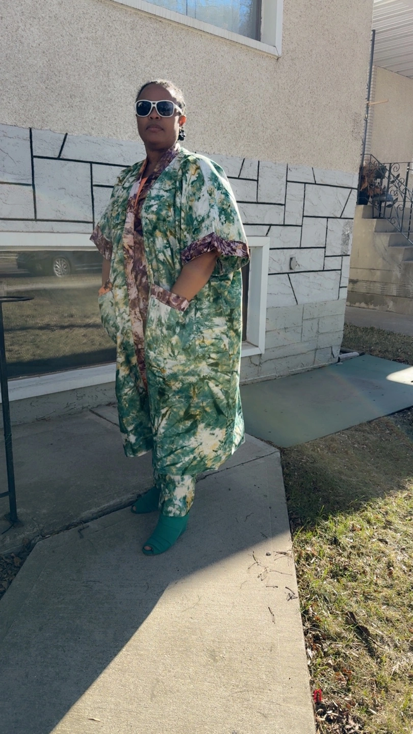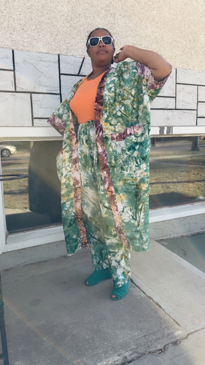 Gorgeous two-piece tie-dye outfit. Features a long-sleeved kimono and matching pants. Relaxed fit. Beautiful colours.