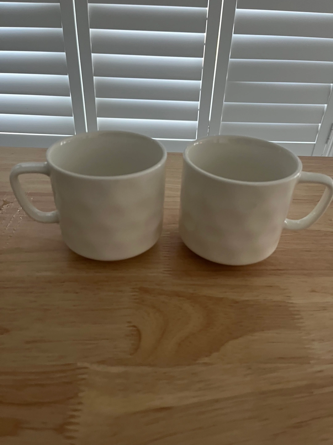Two simple white ceramic mugs. Small, perfect for espresso or a quick coffee.