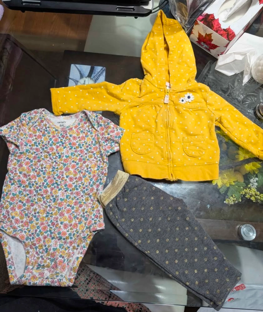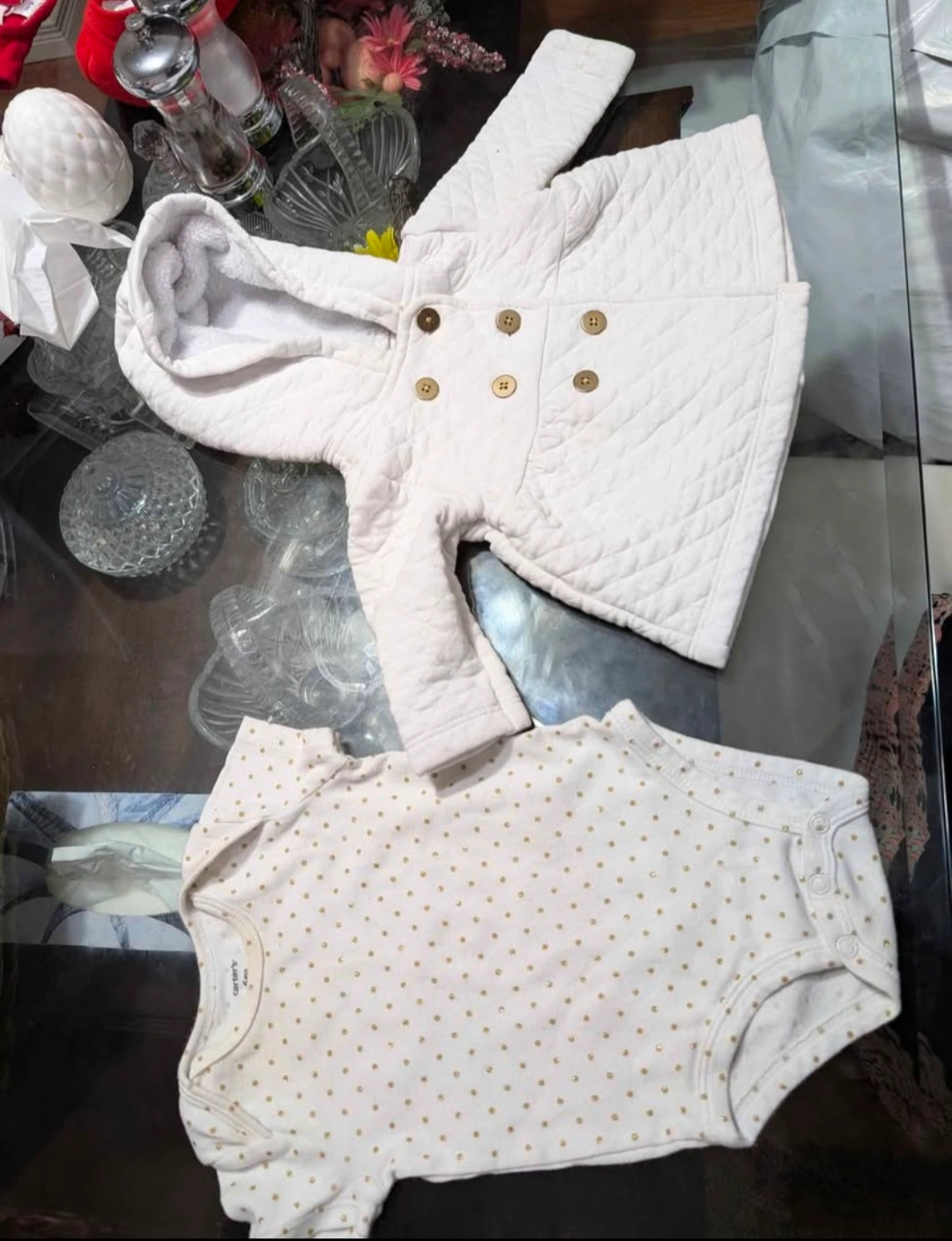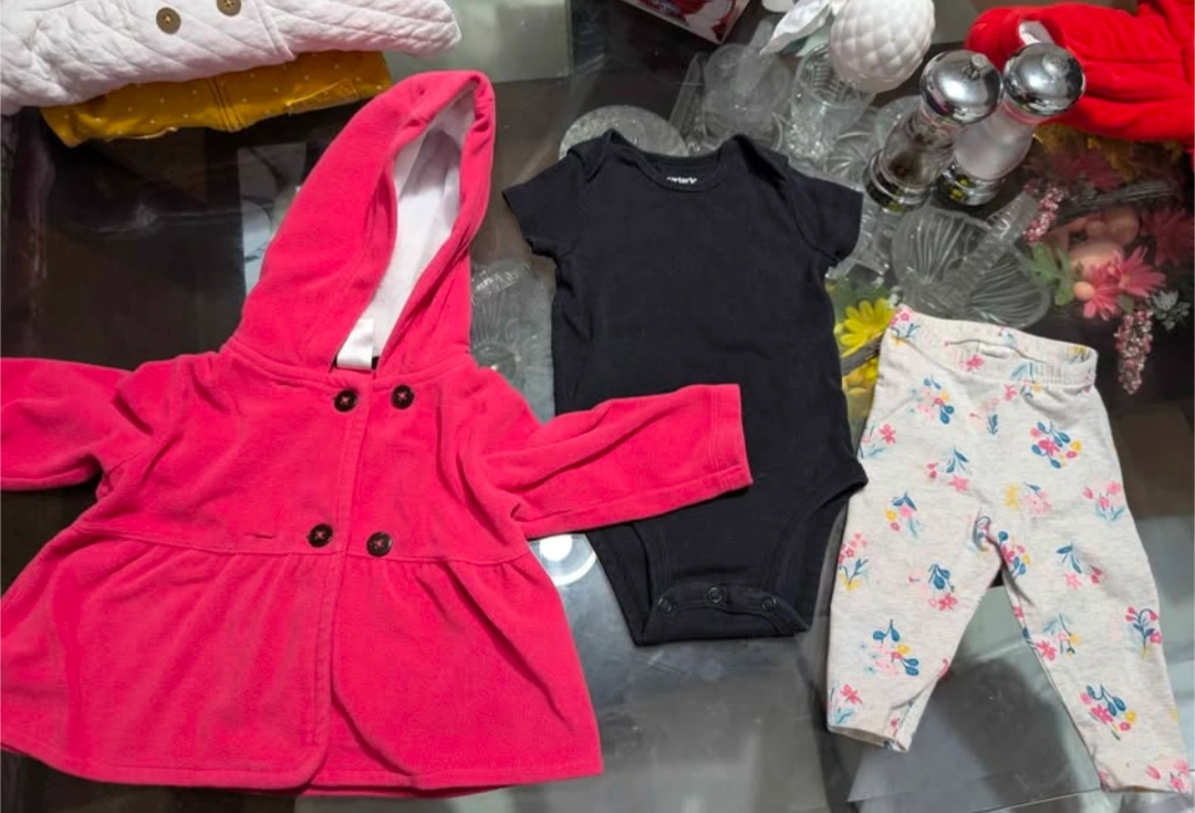 Bundle of adorable baby girl clothes. Includes various jackets, bodysuits, and leggings. Perfect for keeping your little one warm and stylish. Great condition. Sizes are 6 months. White hoodie have a spot on it shown in the picture but it's not visible when you close the buttons.