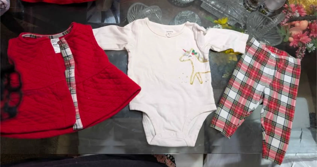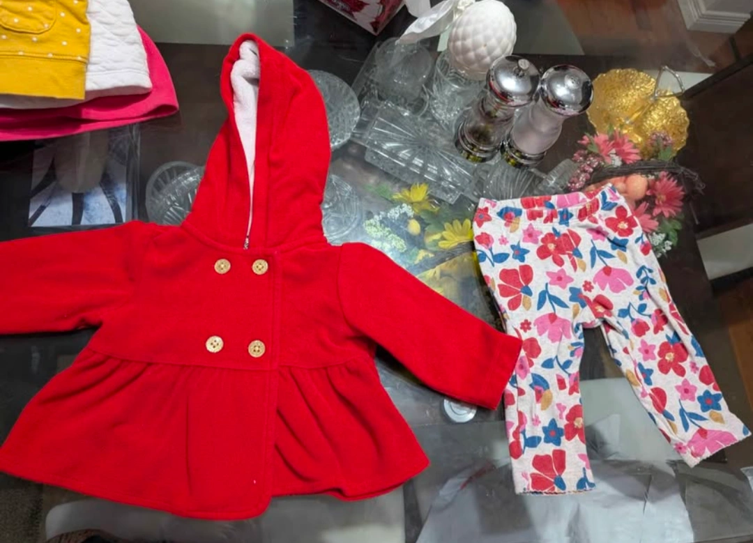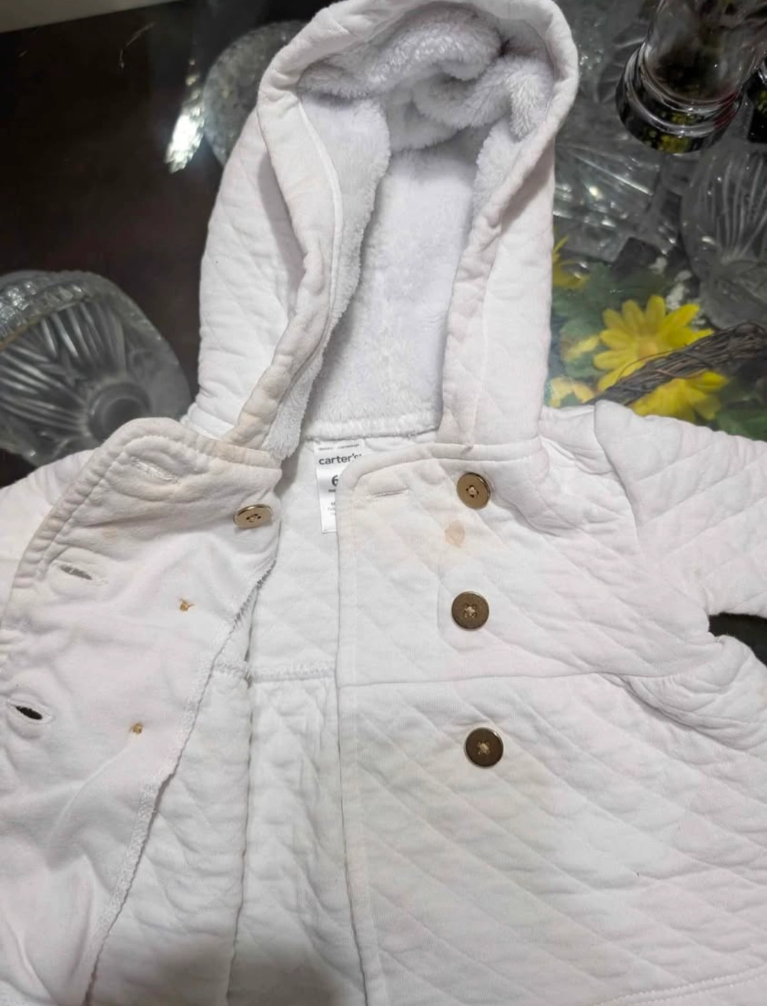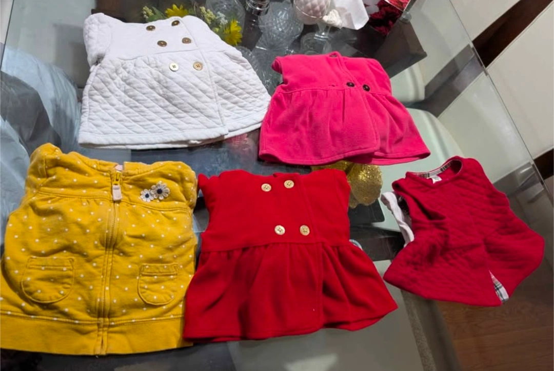 Bundle of adorable baby girl clothes. Includes various jackets, bodysuits, and leggings. Perfect for keeping your little one warm and stylish. Great condition. Sizes are 6 months. White hoodie have a spot on it shown in the picture but it's not visible when you close the buttons.