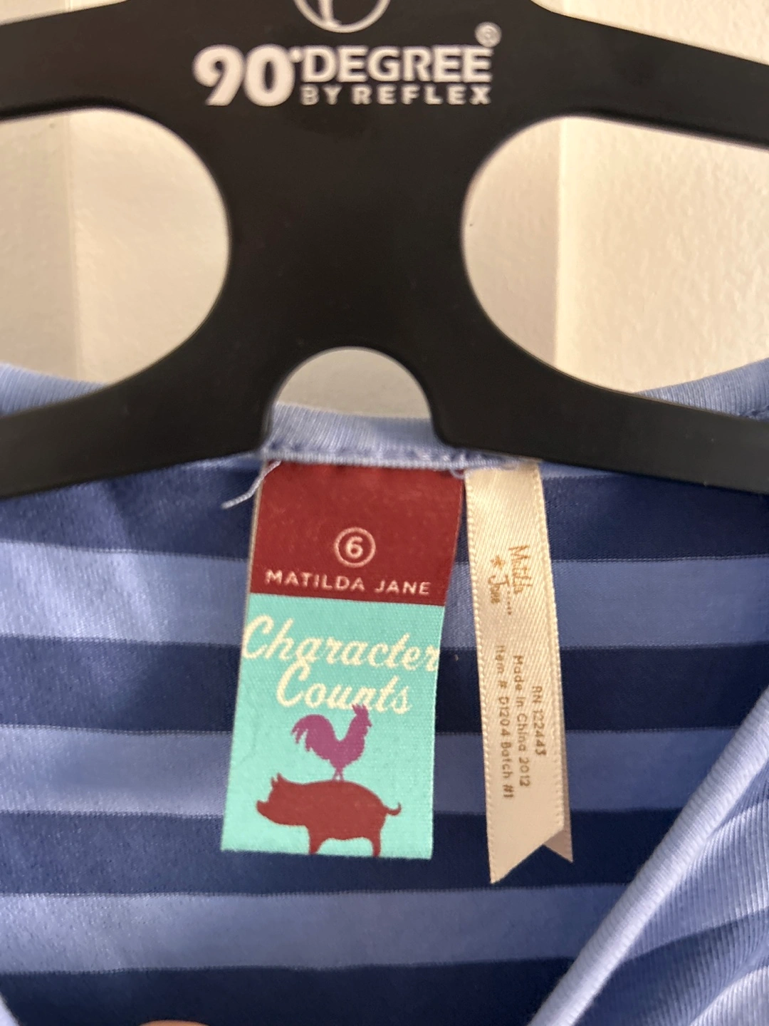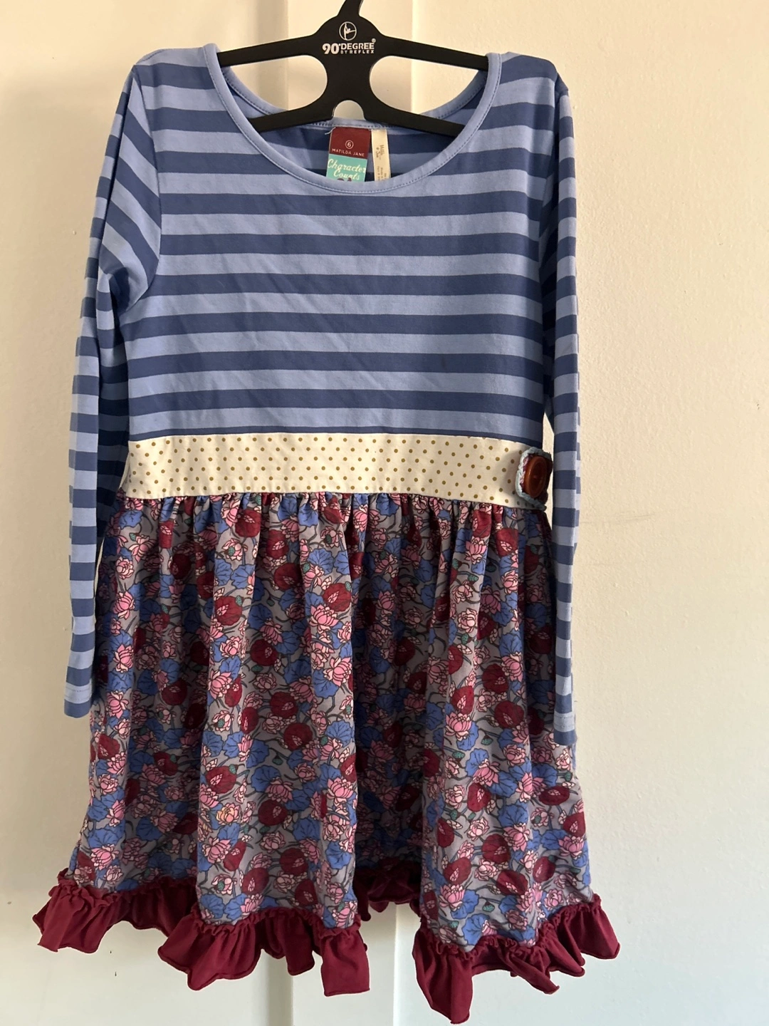Adorable Matilda Jane dress. Size 6. Features blue and white stripes, floral print skirt, and burgundy ruffle trim. Long sleeves. Excellent condition.