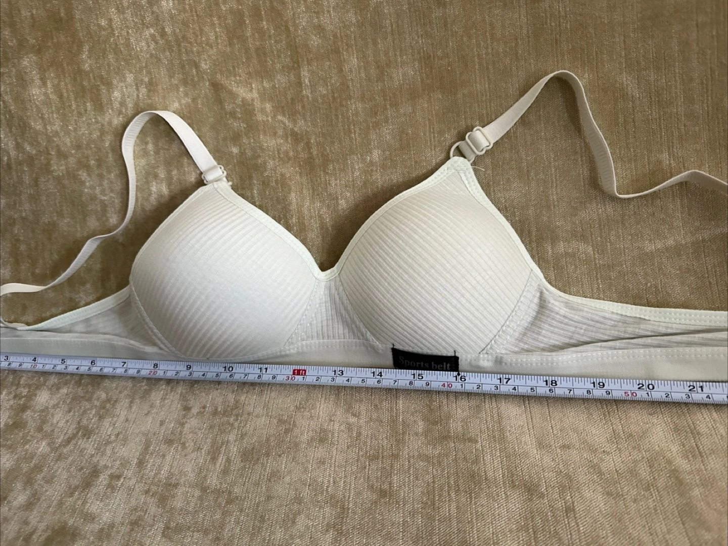 Light green ribbed comfort bra. Adjustable straps. Lightly padded cups. Excellent support.