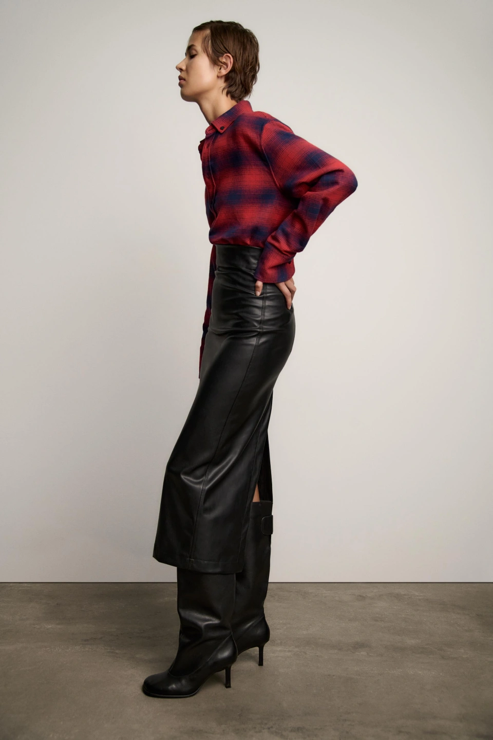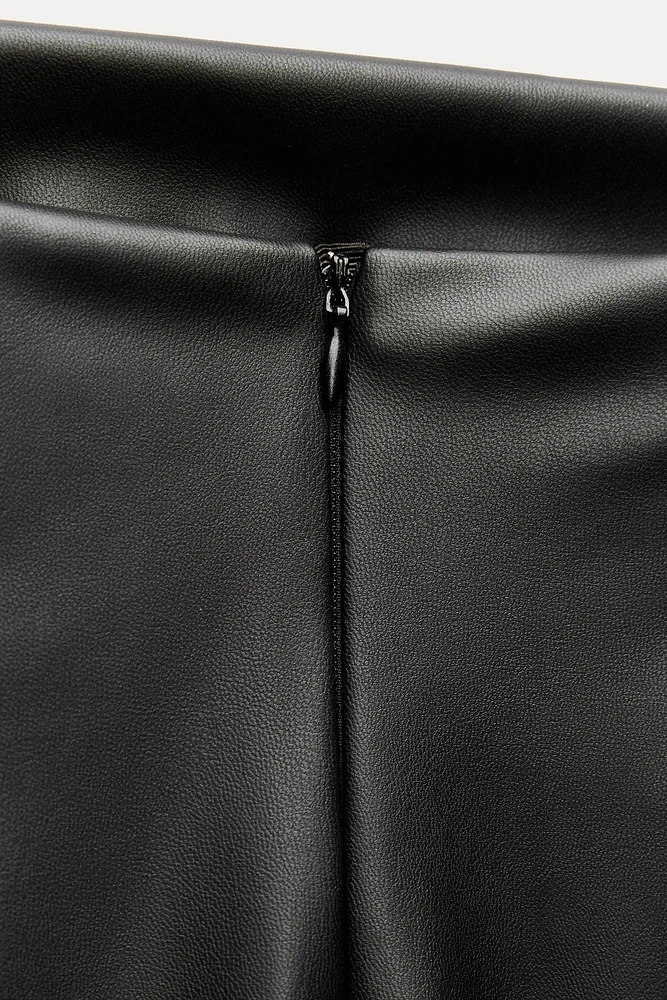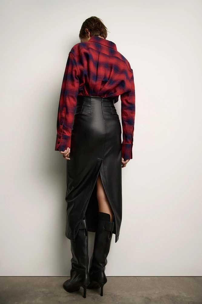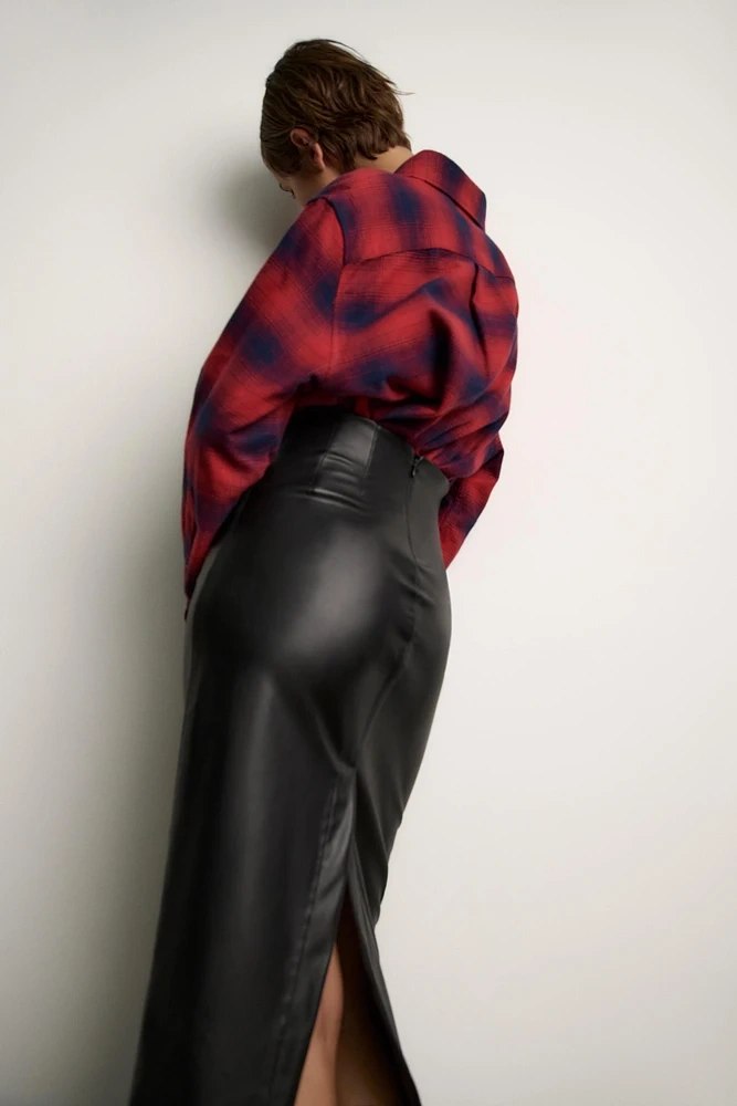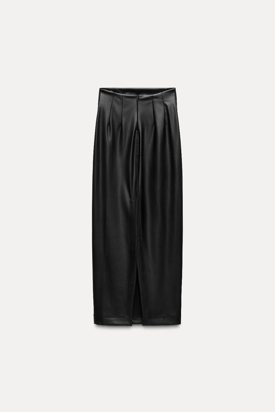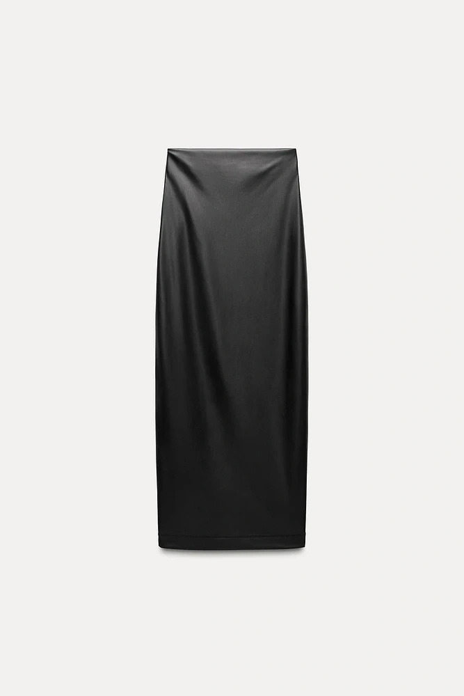 125Stylish black faux leather midi skirt. Features a high waist and a centre back slit. Great for a night out or dressed down. New without tags retails $110