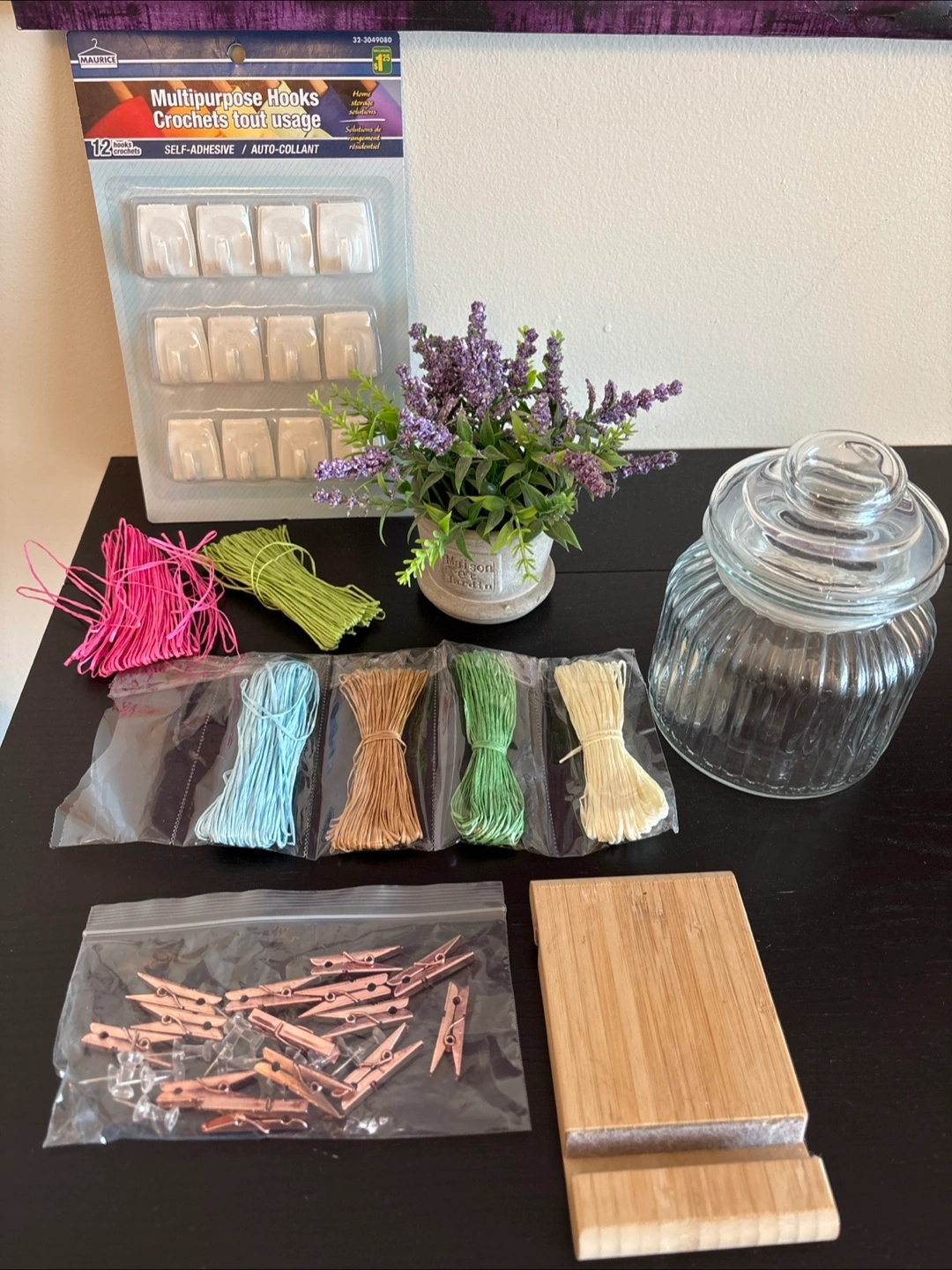 Bulk craft supplies. Includes self-adhesive multipurpose hooks, coloured twine, rose gold mini clothespins, and a small bamboo phone stand. Also features a decorative glass jar and faux lavender plant.