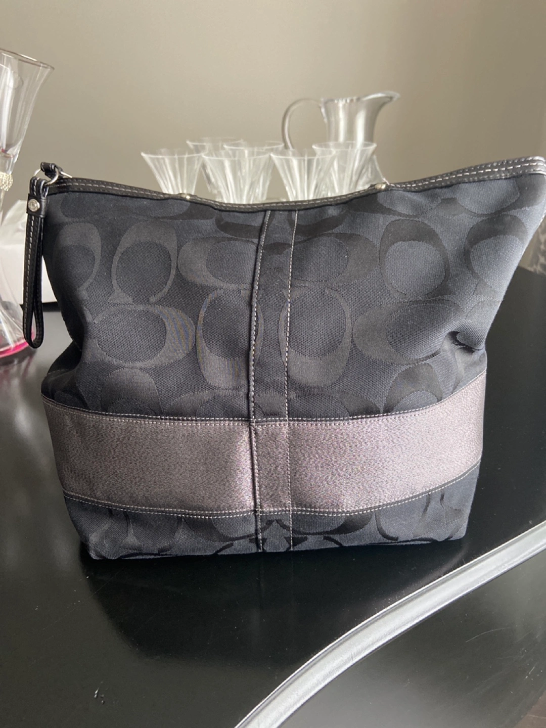 20Large black Coach tote bag. Signature C pattern. Grey accent band. Leather handles and zipper closure. Interior zipper pocket. Excellent pre-owned condition.