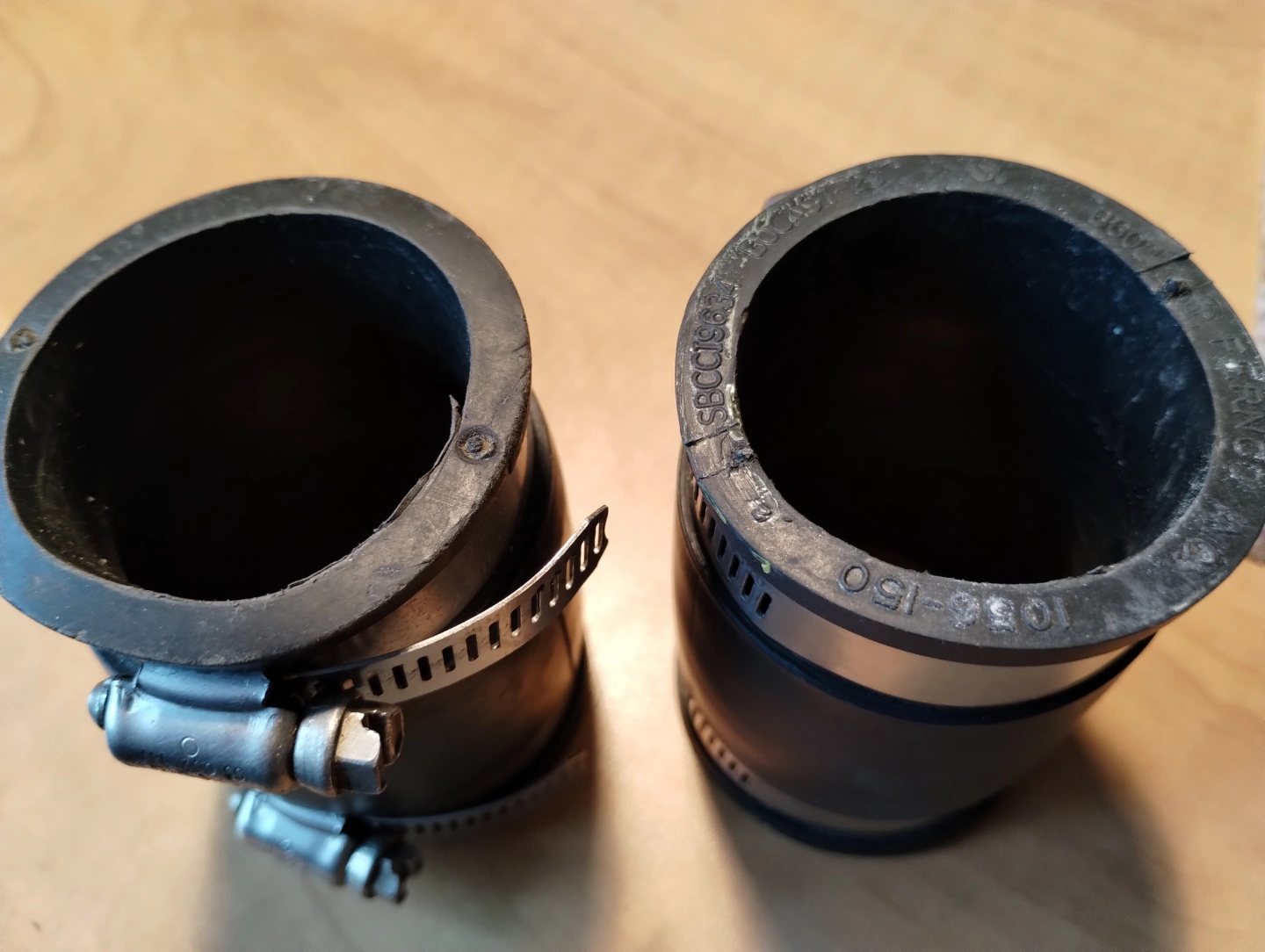 Pair of used 1 1/2" black rubber couplings. Connects cast iron and plastic pipes. Allows slight movement between noints. Includes stainless steel clamps. Shows slight wear. includes all the stainless hardware fittings as in pictures.