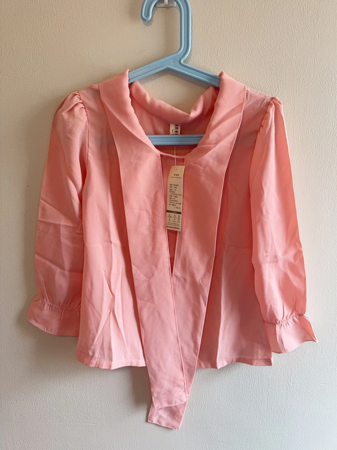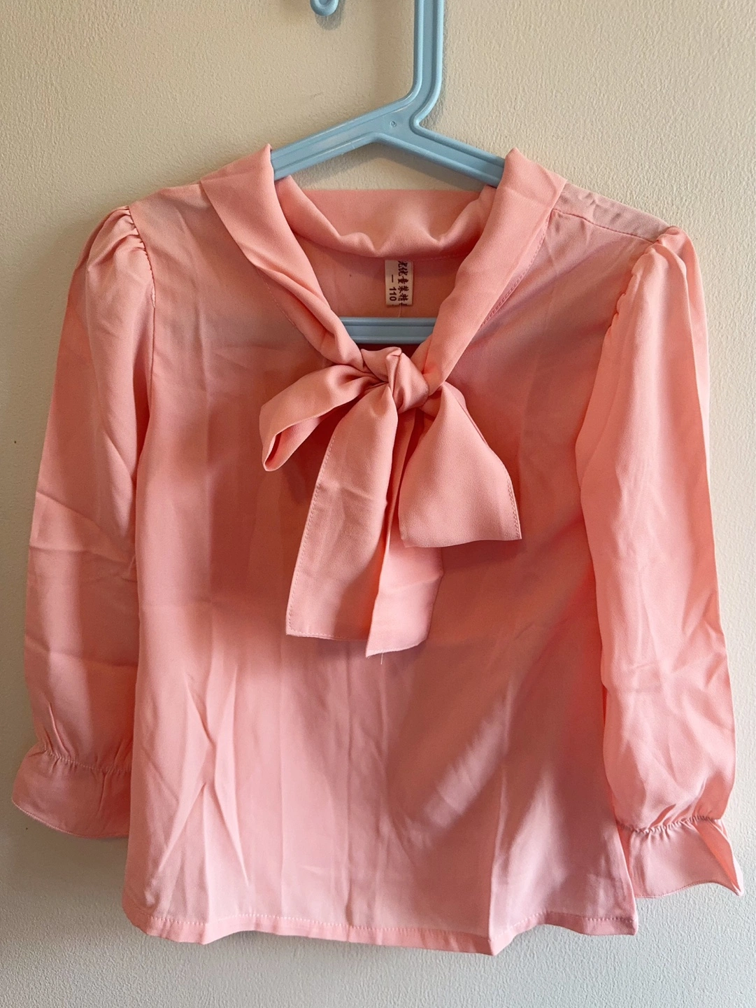 Adorable light pink blouse. Features a cute bow tie at the neckline. Lightweight material. Perfect for spring or summer.
