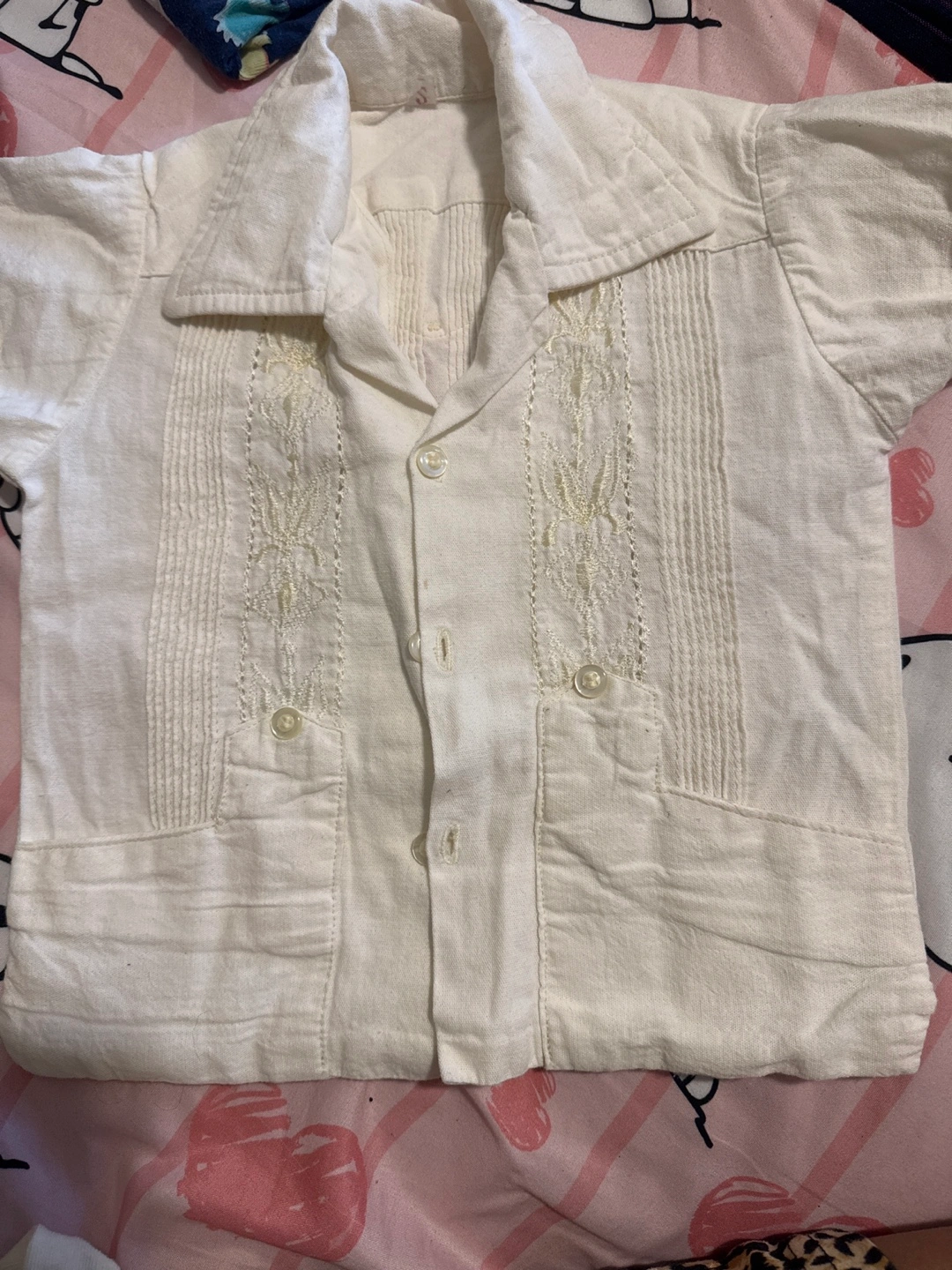 Baby boy Cream-coloured, short-sleeved button-up shirt. Features delicate embroidery and pleated detailing. Button closure. Pockets.
