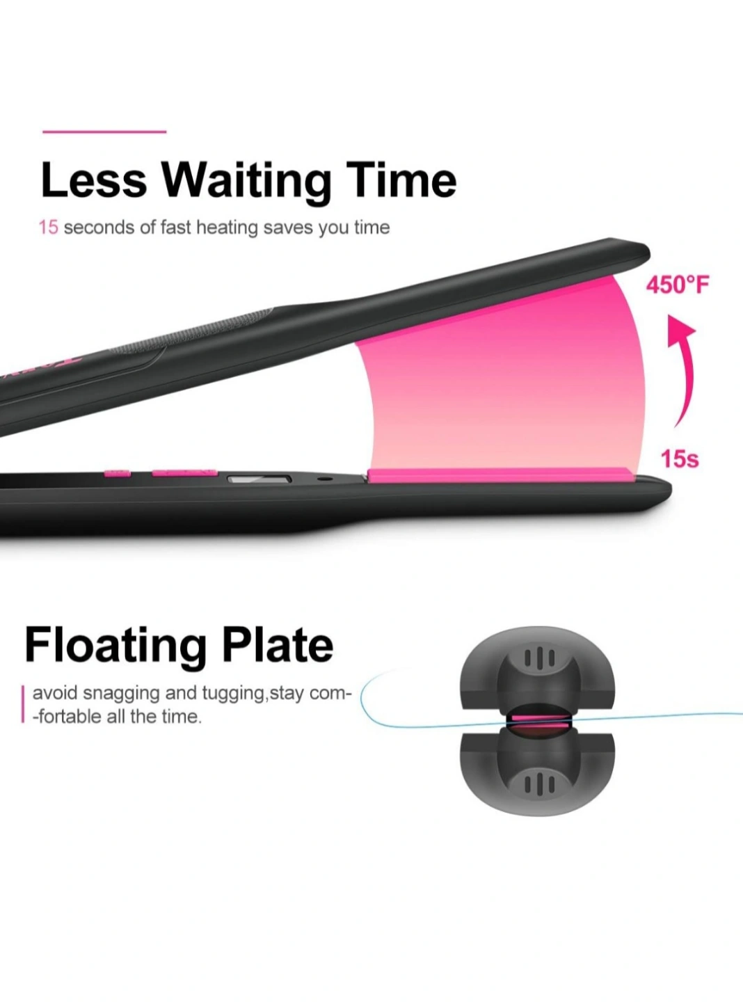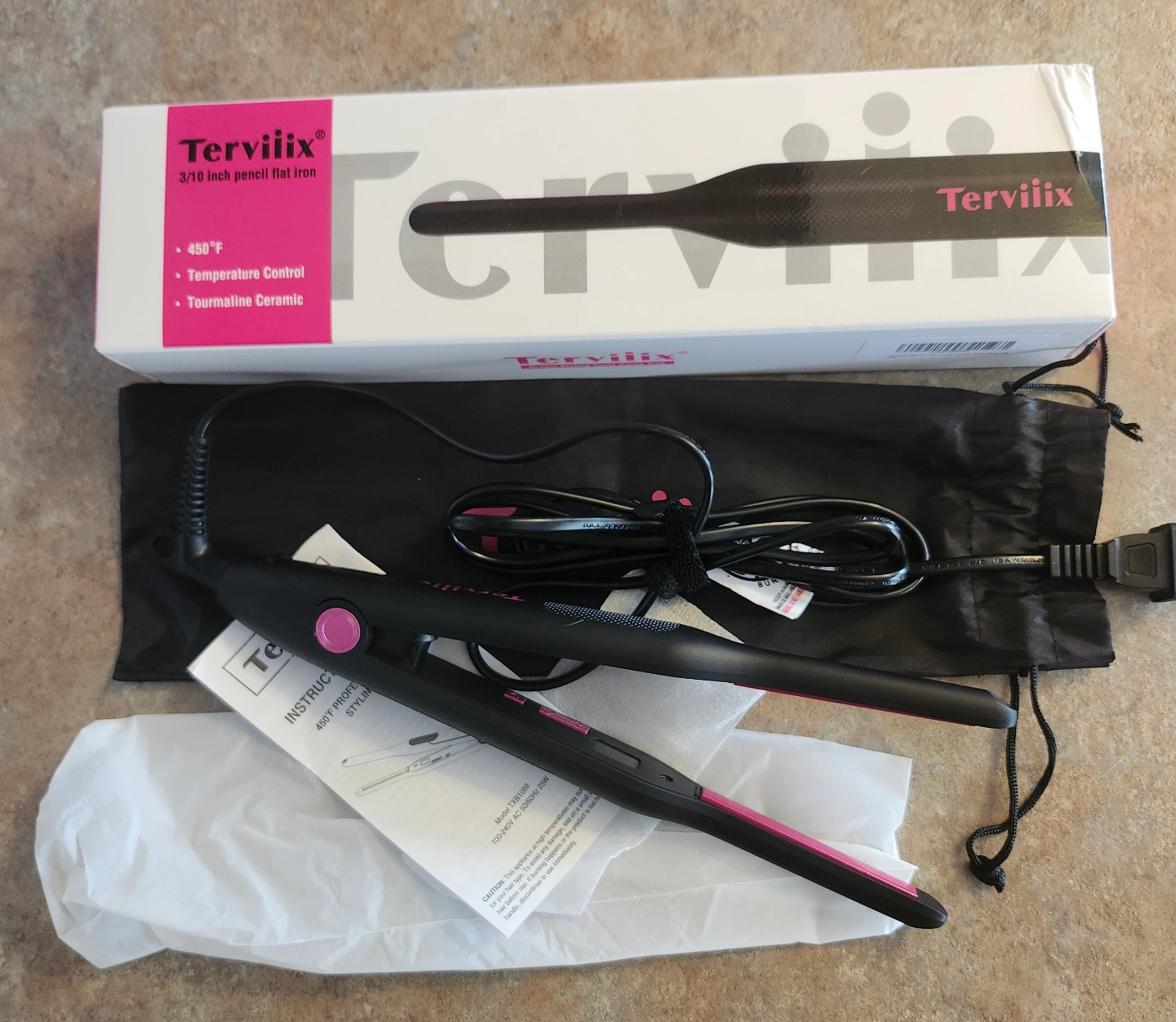 New Terivilix 3/10 inch pencil flat iron. Features tourmaline ceramic plates, temperature control, and a 450°F max temperature. Includes carrying bag and instructions.