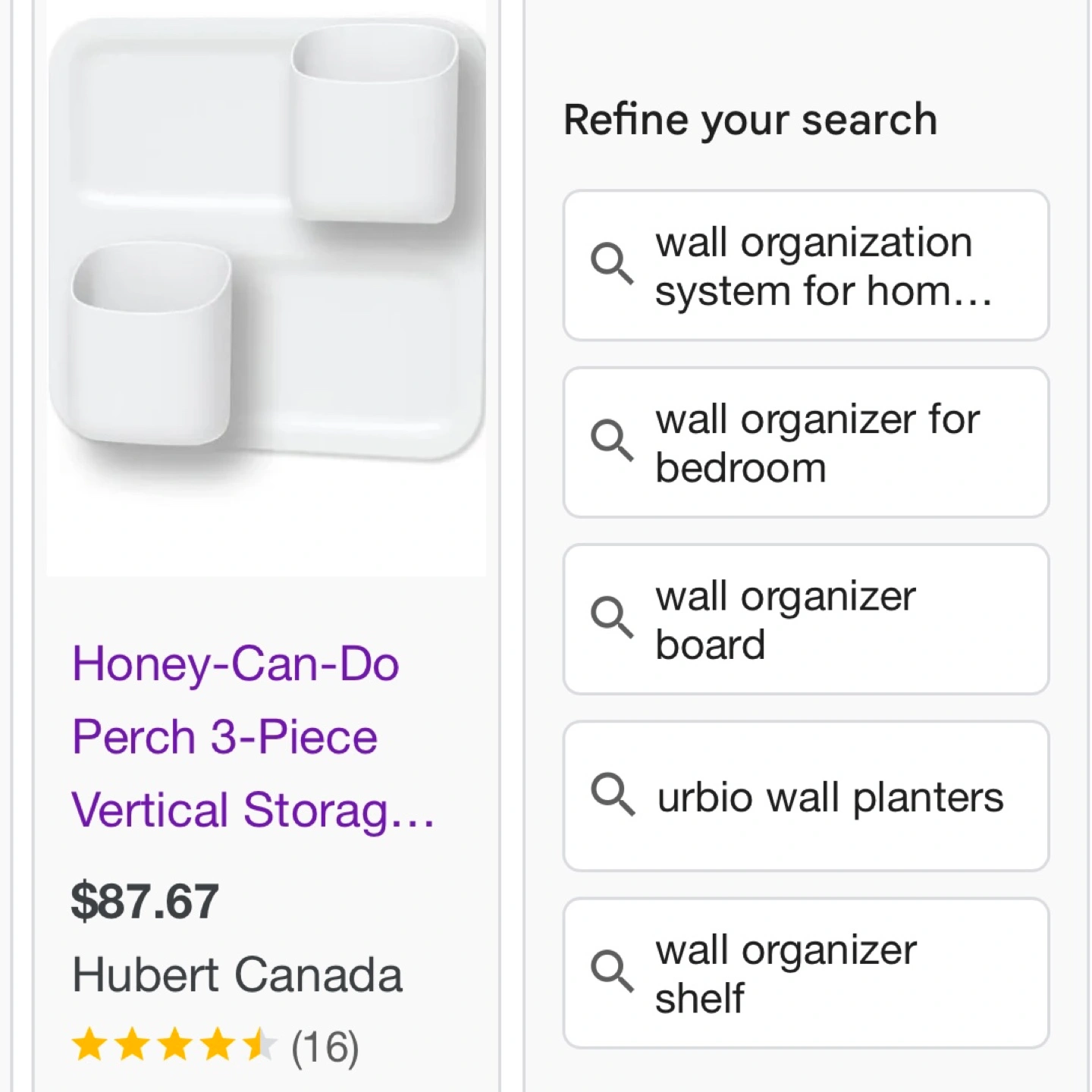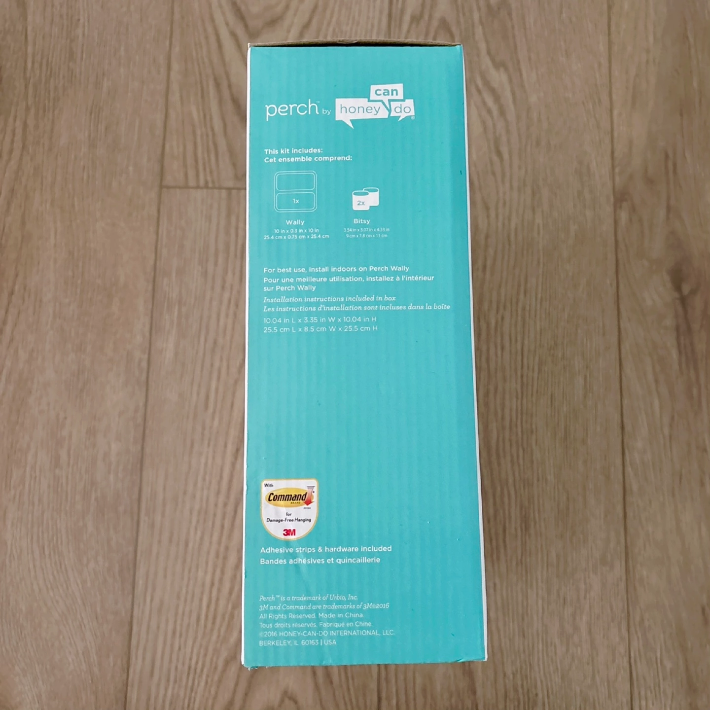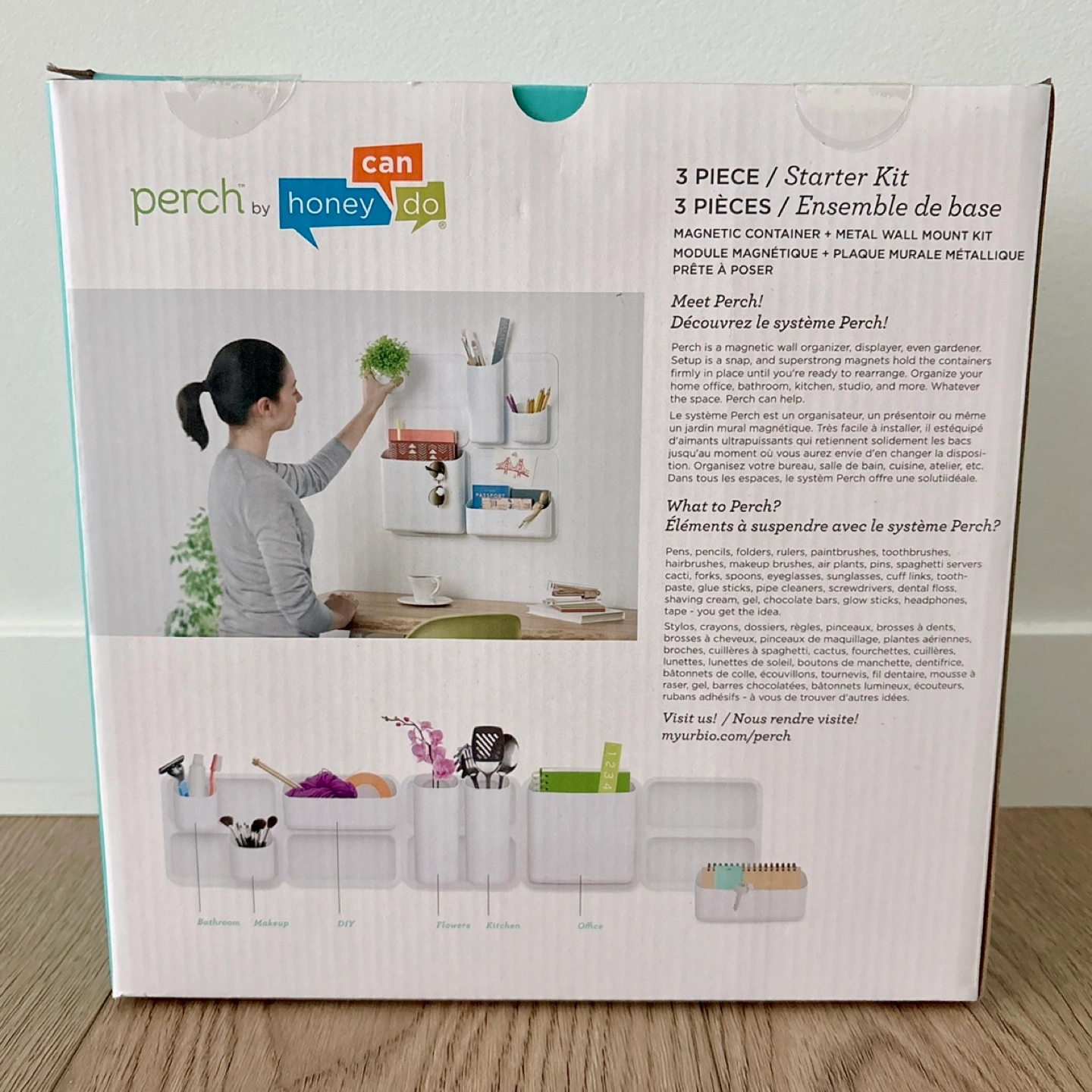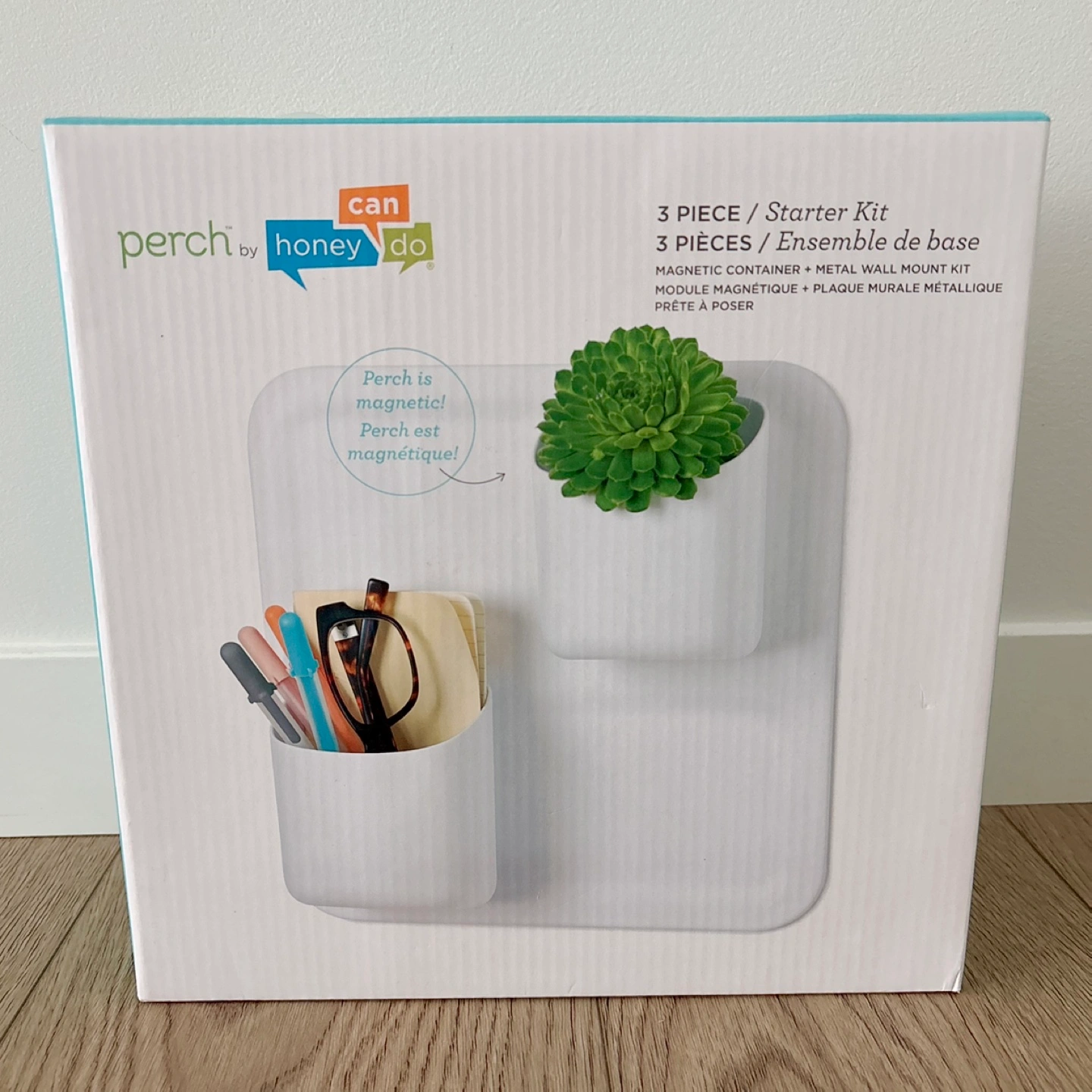 Perch 3 piece starter kit. Includes 1 “Wally” wall mount and 2 “Bitsy” magnetic containers, 8 Command large strips, 10 Philips flat head screws, 10 drywall anchors and instructions.