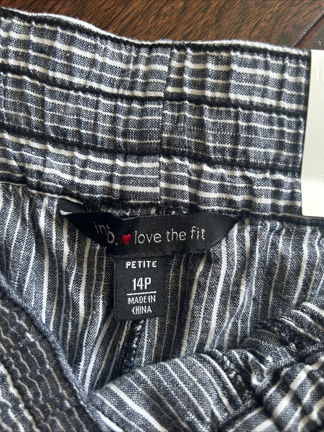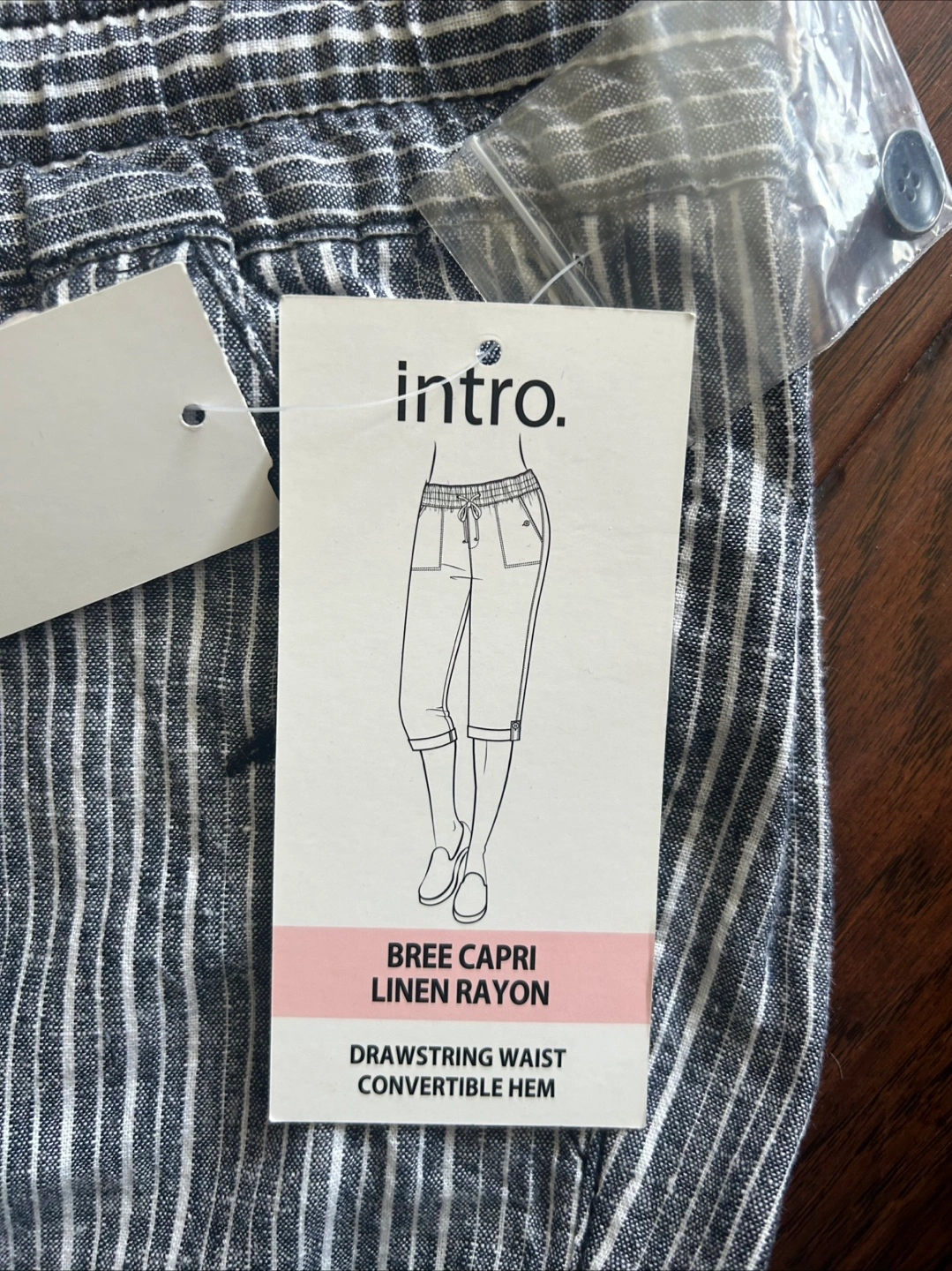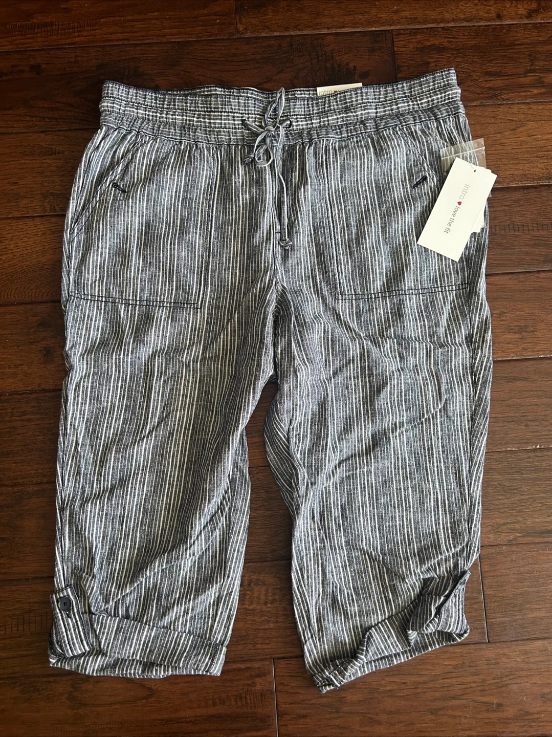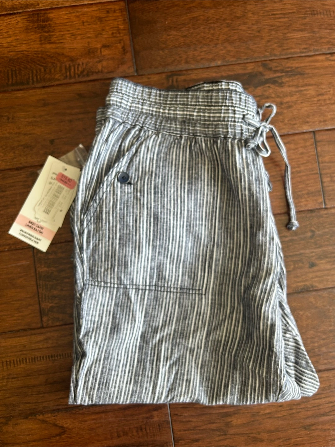 Striped capri pants made with linen rayon, drawstring waist and convertible hem. Has pockets with button closure at the front and open pockets at the back. New with tags. Petite size 14P. Comparable price is $44, bought for $15.
