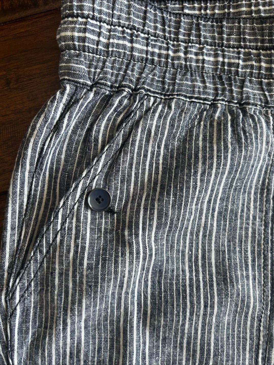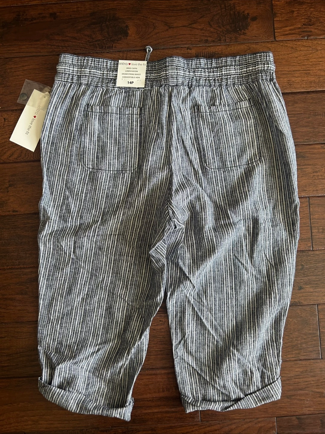 Striped capri pants made with linen rayon, drawstring waist and convertible hem. Has pockets with button closure at the front and open pockets at the back. New with tags. Petite size 14P. Comparable price is $44, bought for $15.