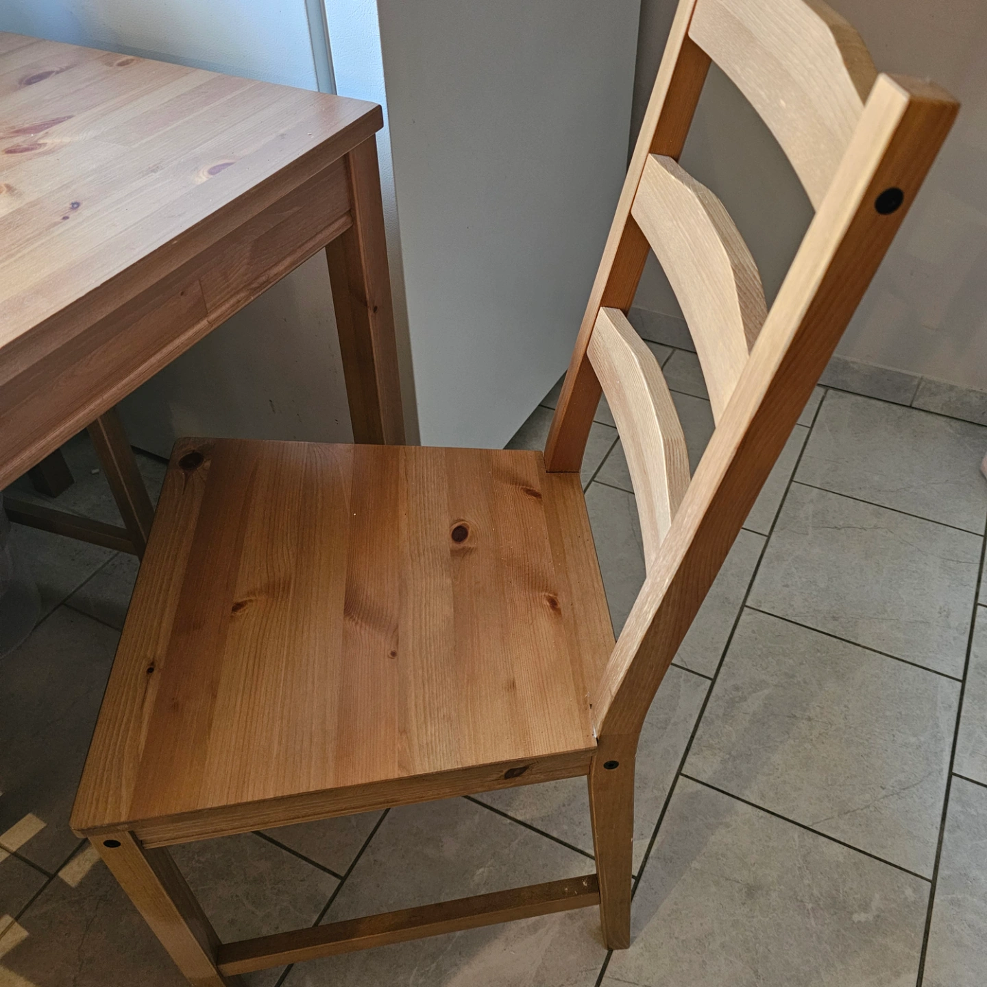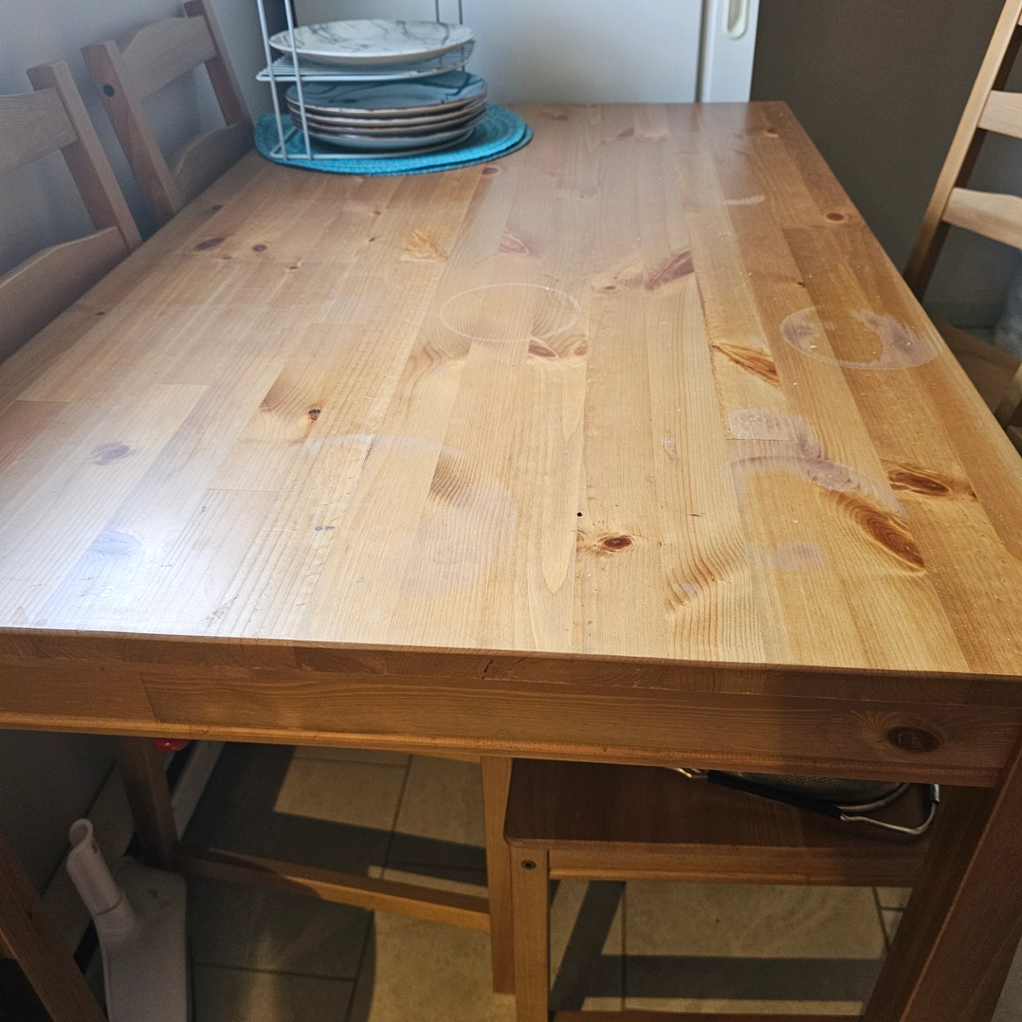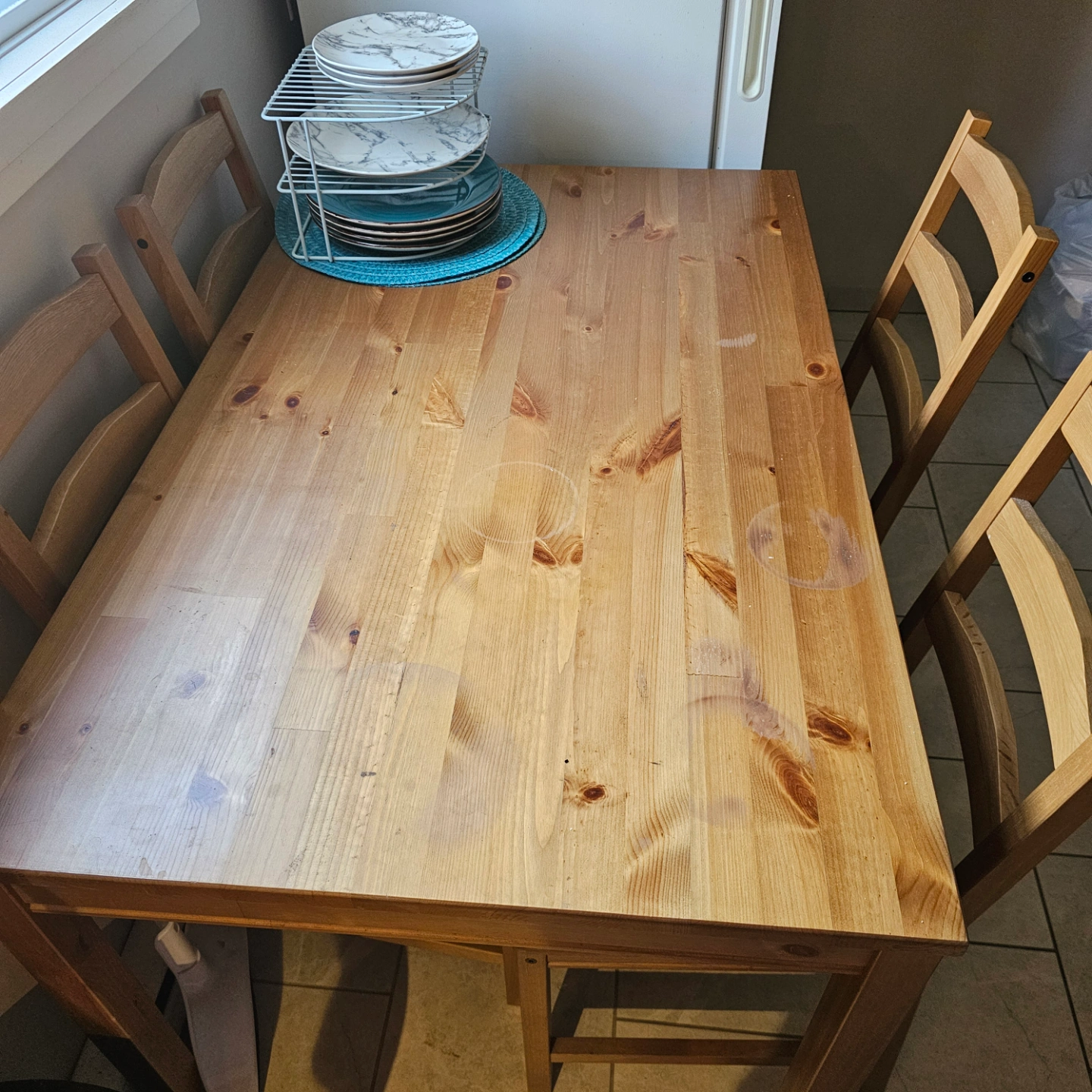 Solid pine wood dining table and four matching chairs. Some water rings on the table. Minimal assembly required.