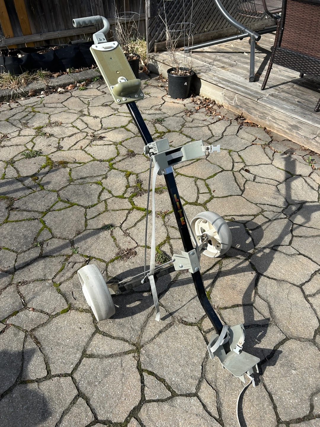 Pre-owned golf clubs and push cart. Clubs show wear. Includes woods and irons. Bag included. Good for collectors or casual players.