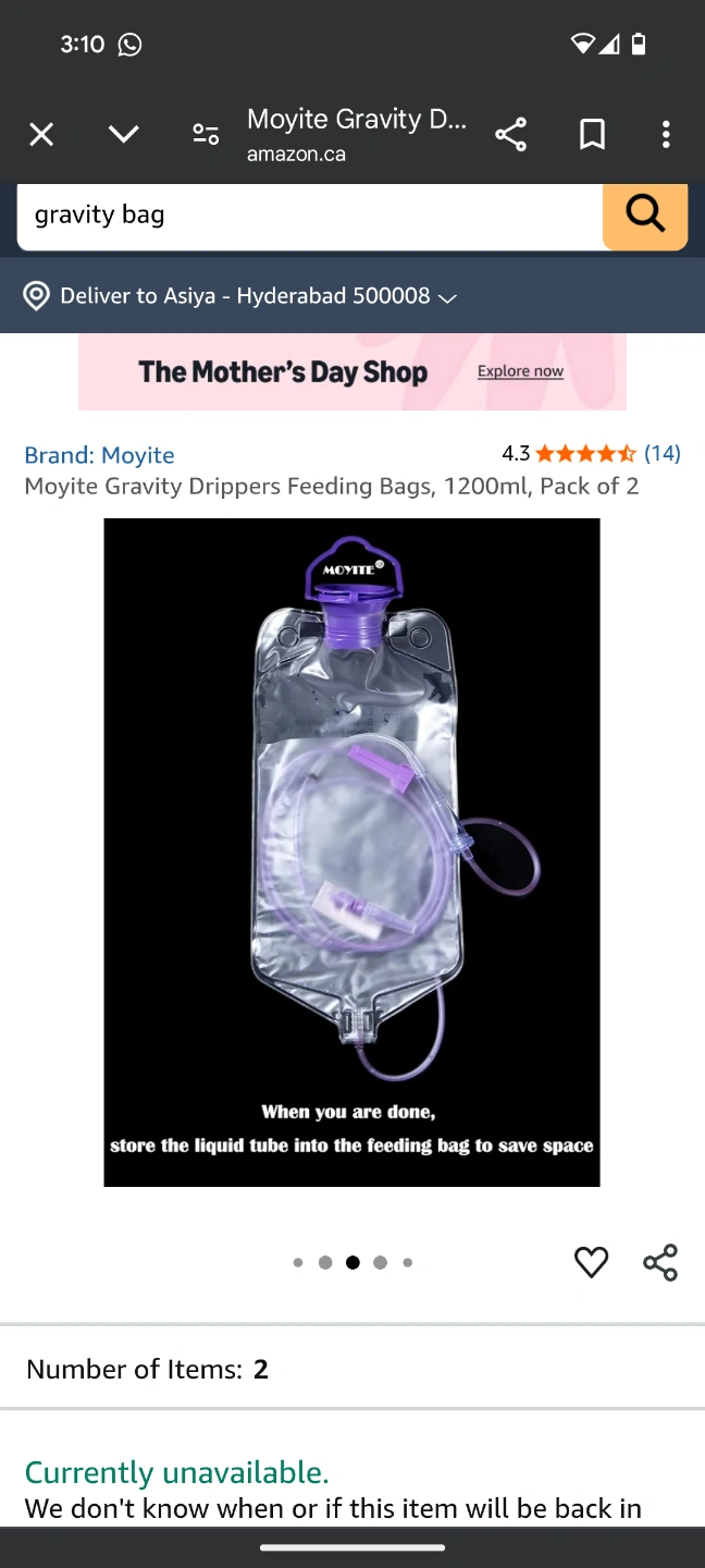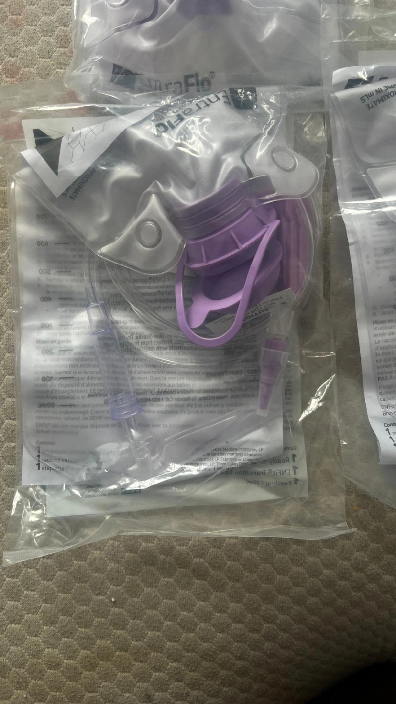 Two 1200ml Moyite gravity feeding bags. New, unopened. Purple drip chamber and tubing. Ideal for feeding.