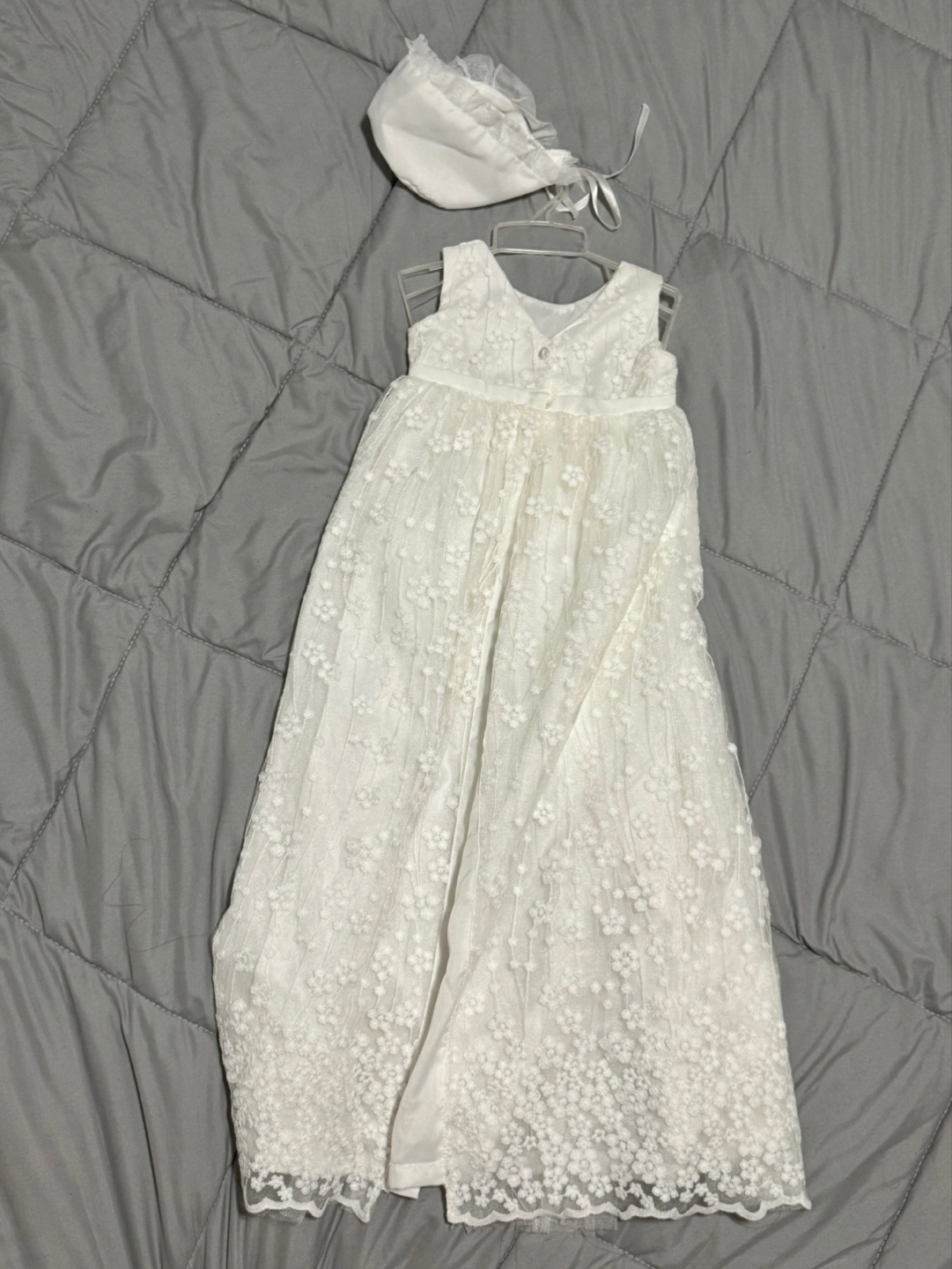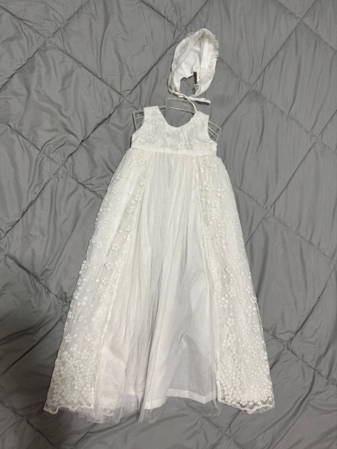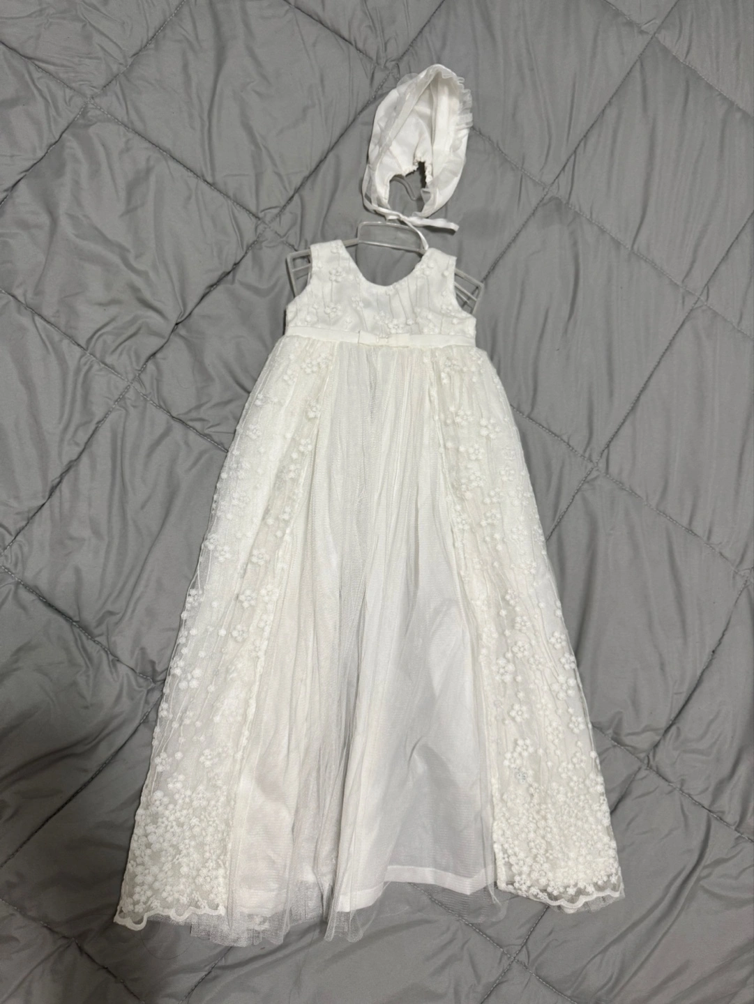 Beautiful traditional white christening gown. Features delicate floral embroidery. Includes matching bonnet. Perfect for a christening/ baptism. From the Philippines