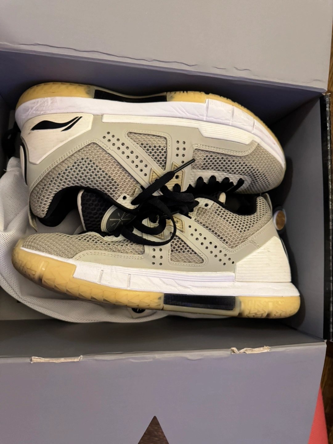 76Men's basketball shoes. Size 9.5. Light beige and black colourway. Mesh upper. Low-top style. Comes in original box.