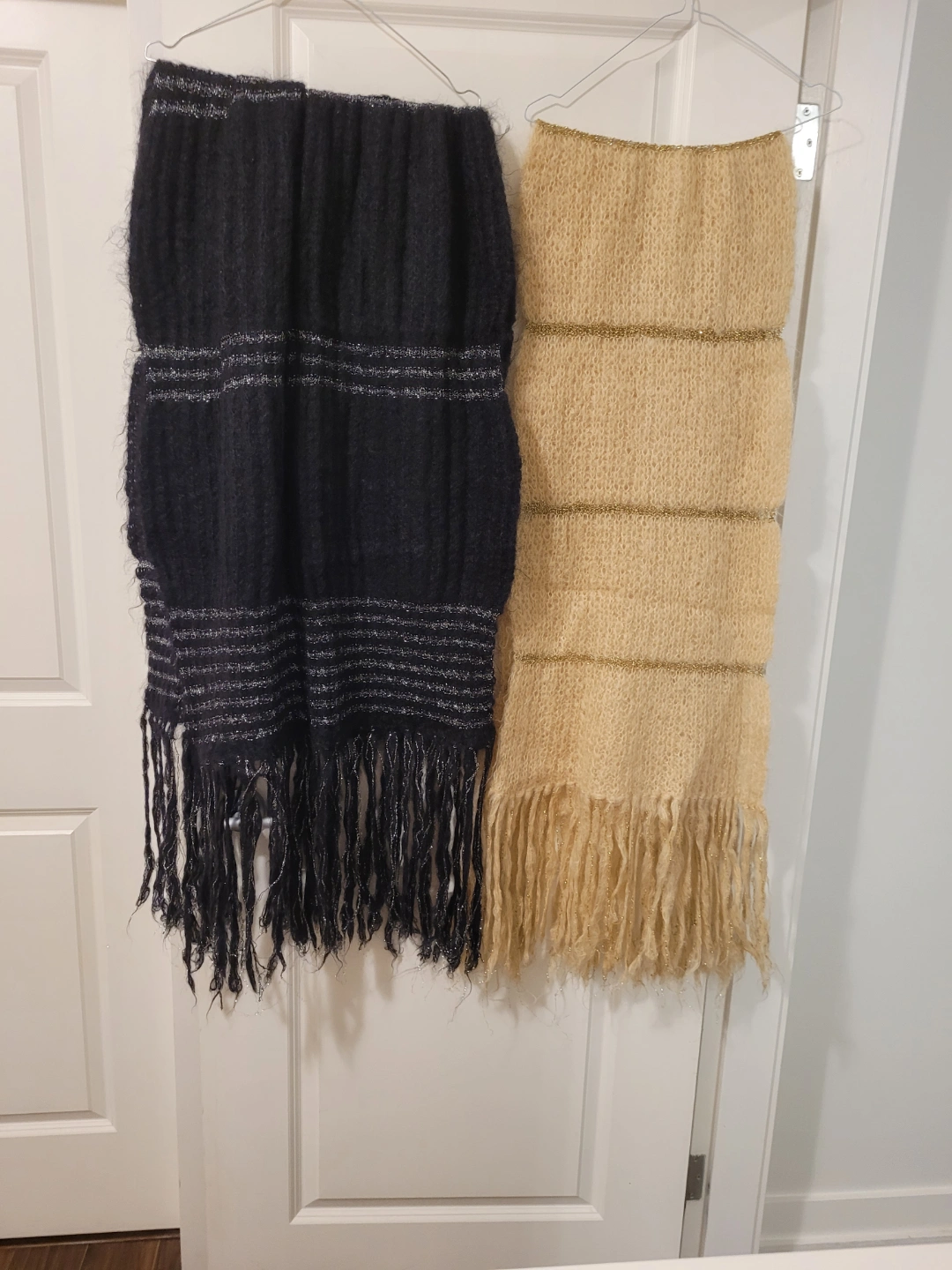 HAND MADE NEW two Pair of long wool fringed scarves. One black with silver stripes, one beige with gold stripes. knit material. Perfect for colder weather.