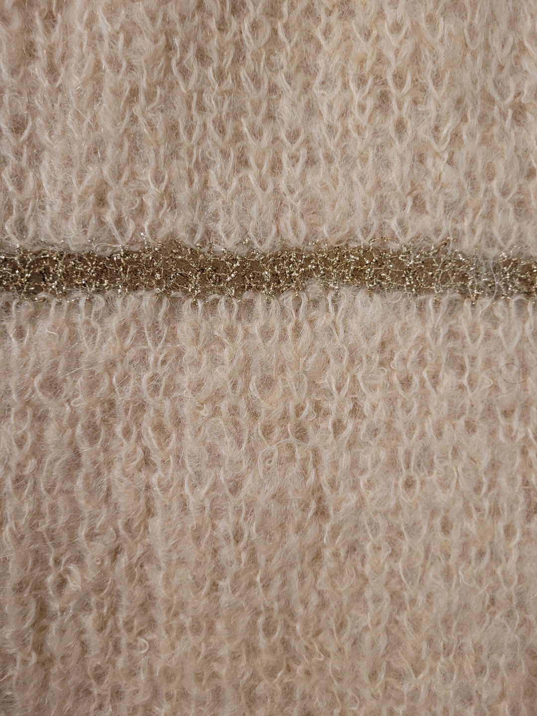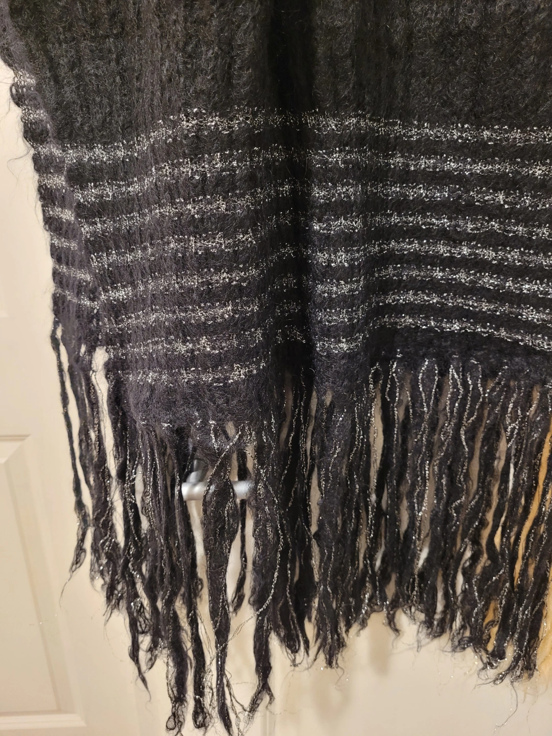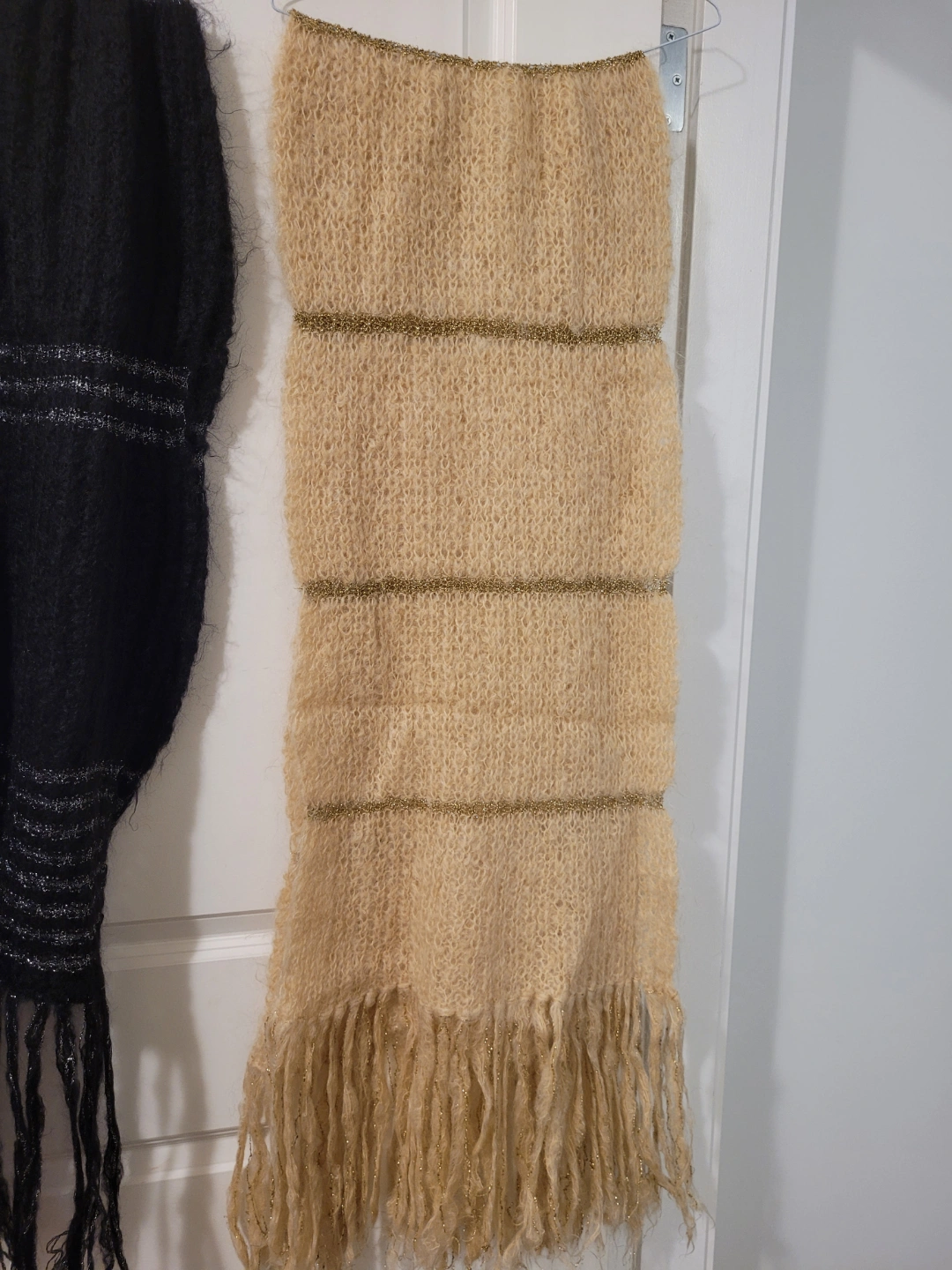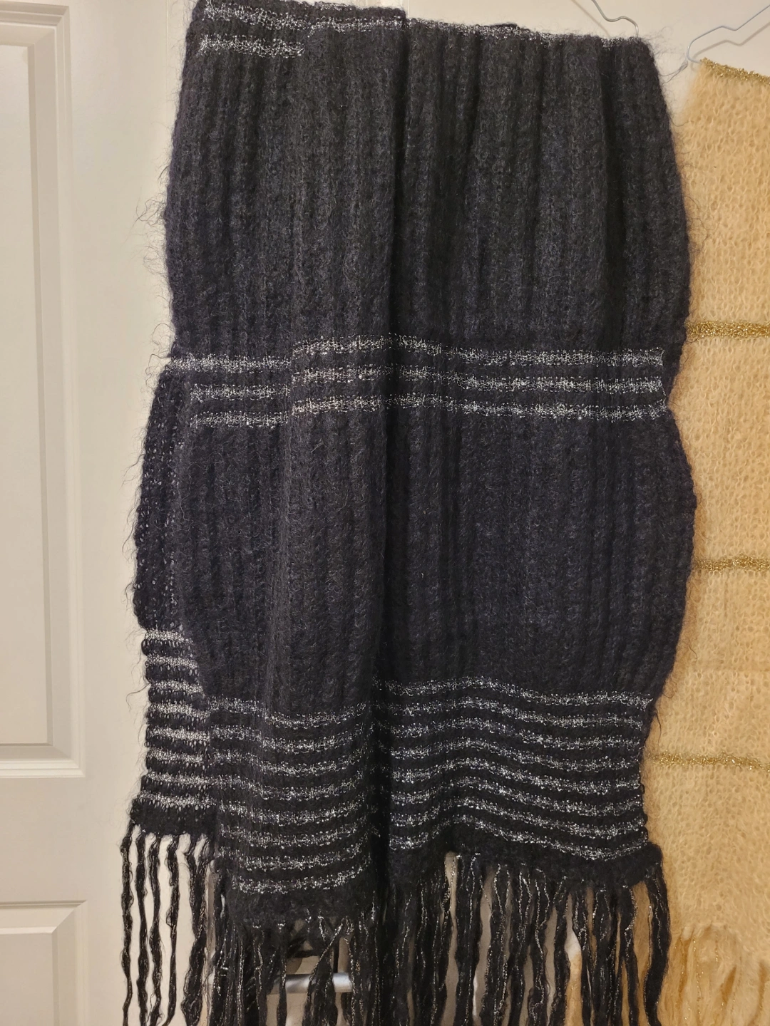 HAND MADE NEW two Pair of long wool fringed scarves. One black with silver stripes, one beige with gold stripes. knit material. Perfect for colder weather.