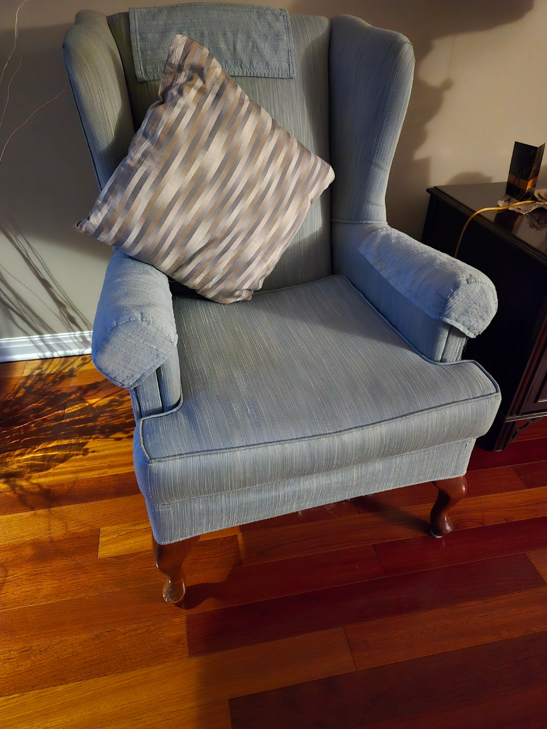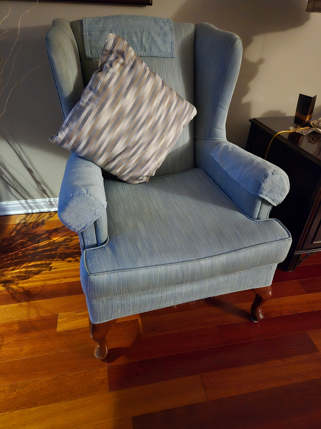 Comfortable wingback chair. Light blue fabric upholstery. Wooden Queen Anne legs. Very good used condition. Arm and back covers/ protectors, same fabric and washable. Delivery possible in the GTA.