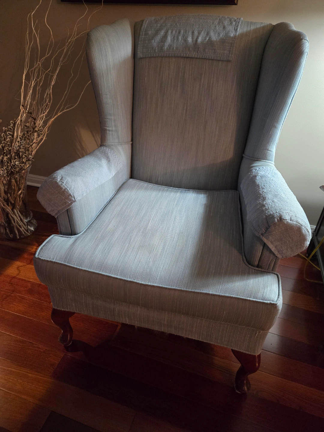 Comfortable wingback chair. Light blue fabric upholstery. Wooden Queen Anne legs. Very good used condition. Arm and back covers/ protectors, same fabric and washable. Delivery possible in the GTA.