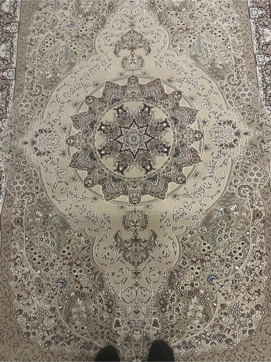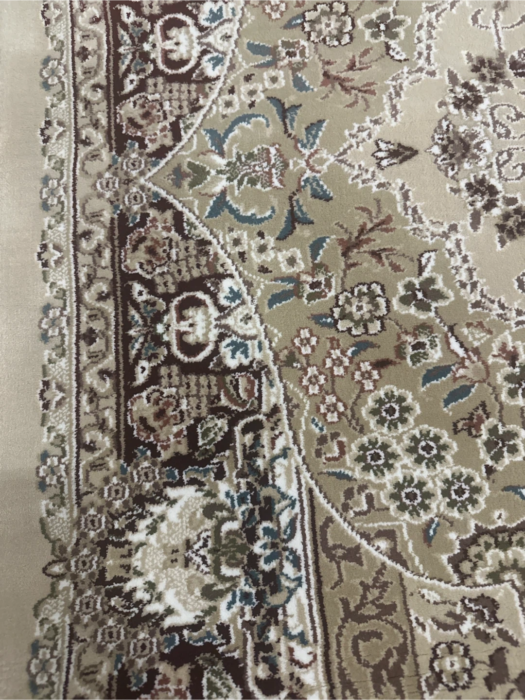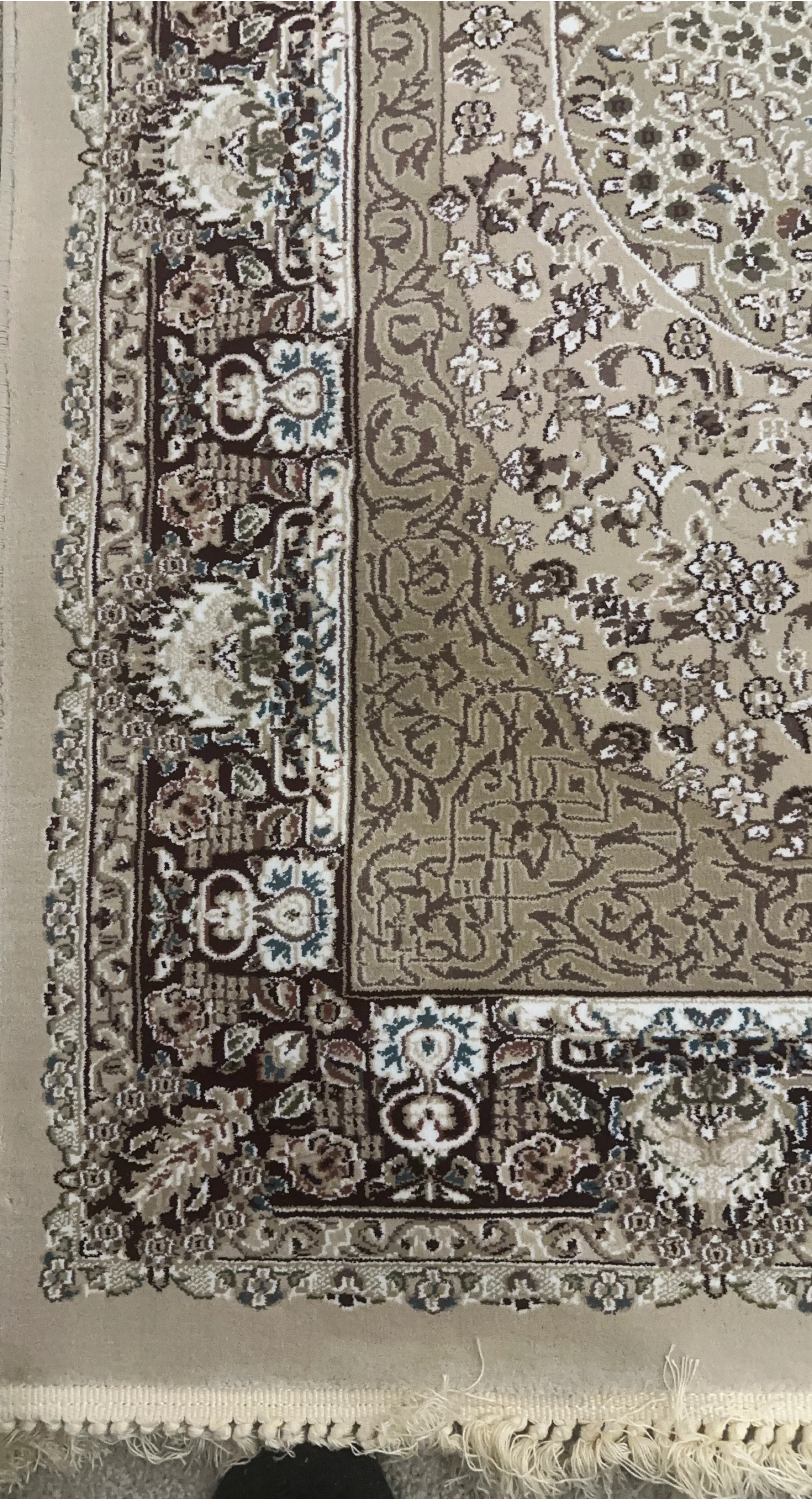Beautifully patterned area rug with intricate floral designs and a traditional border. It features a classic colour palette of ivory-beige, brown, dark red, and cream. The fringed edges add a touch of elegance. Great for adding warmth and style to any room! Made in Turkey.