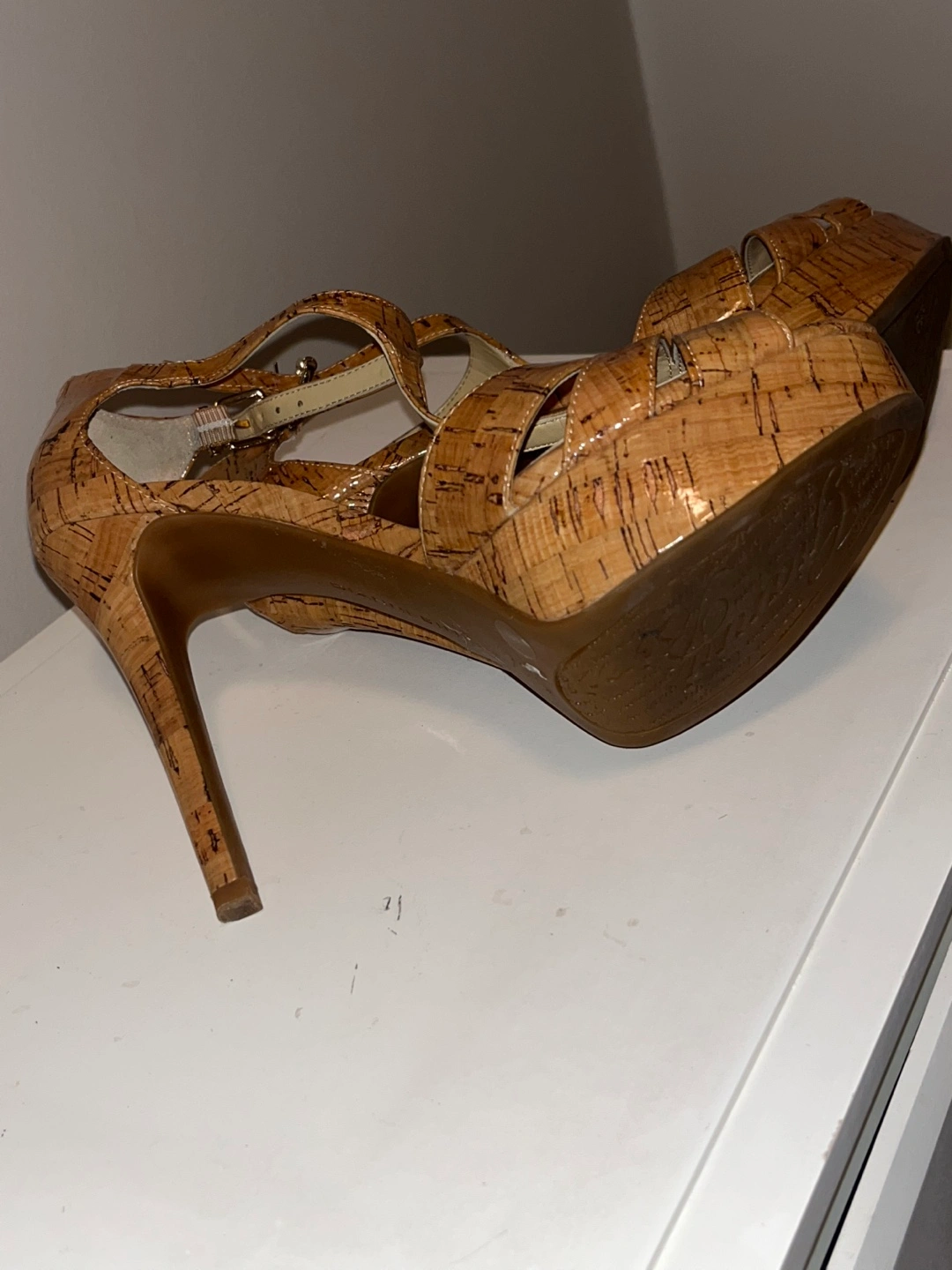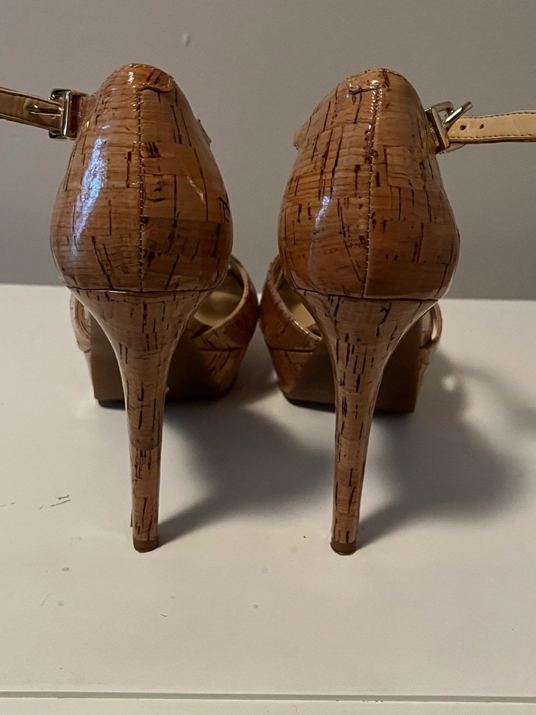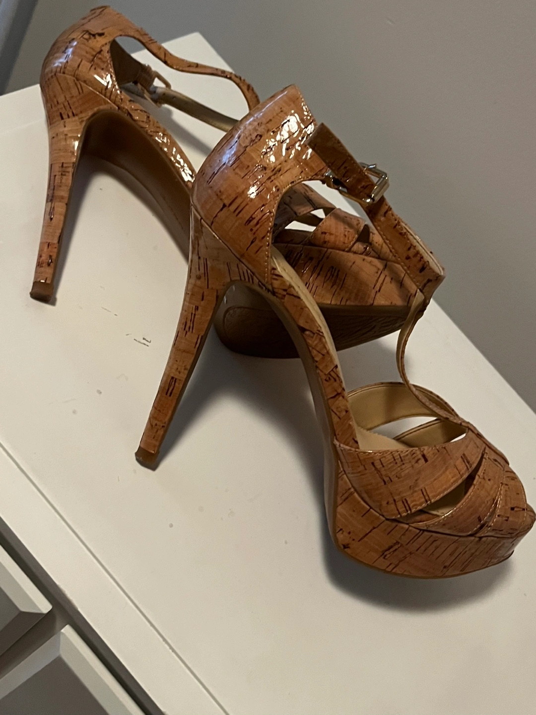 Tan cork platform heels.