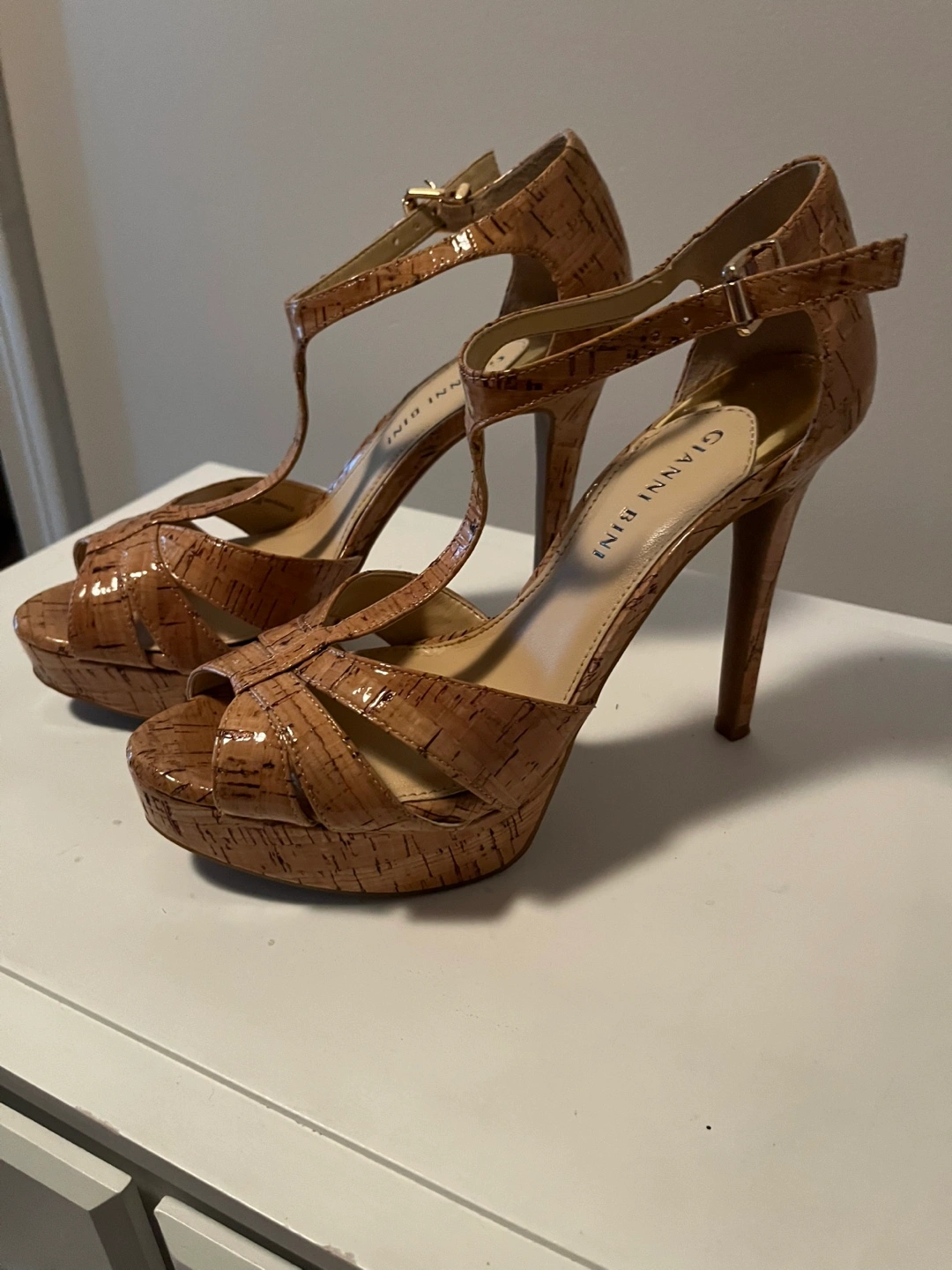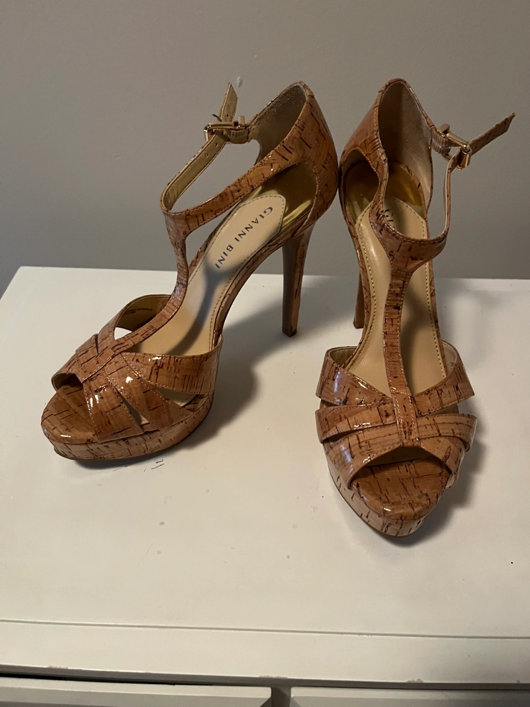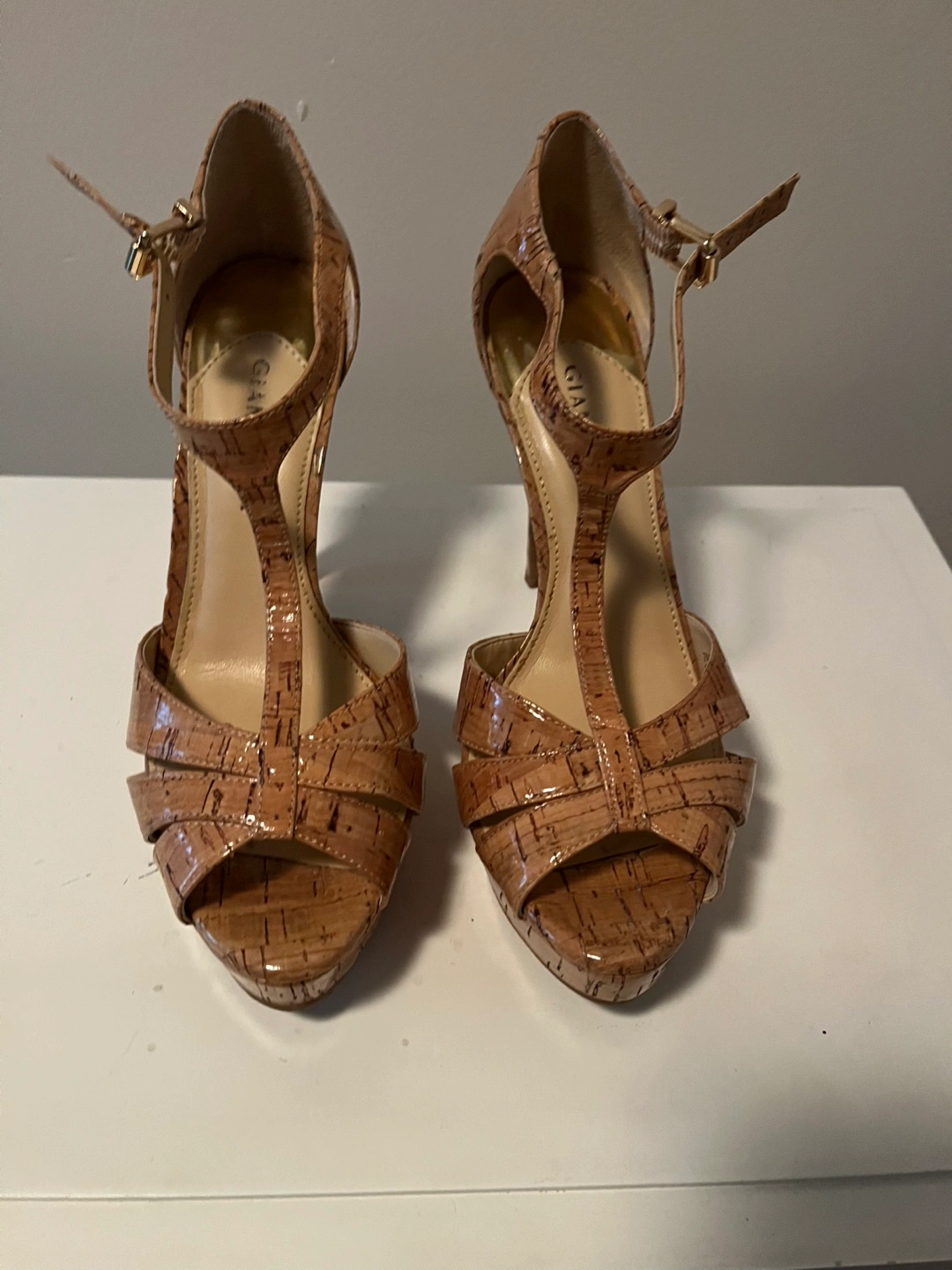 Tan cork platform heels.