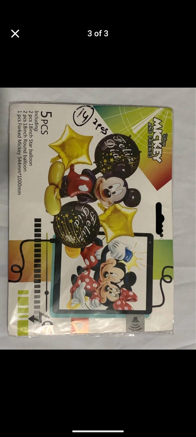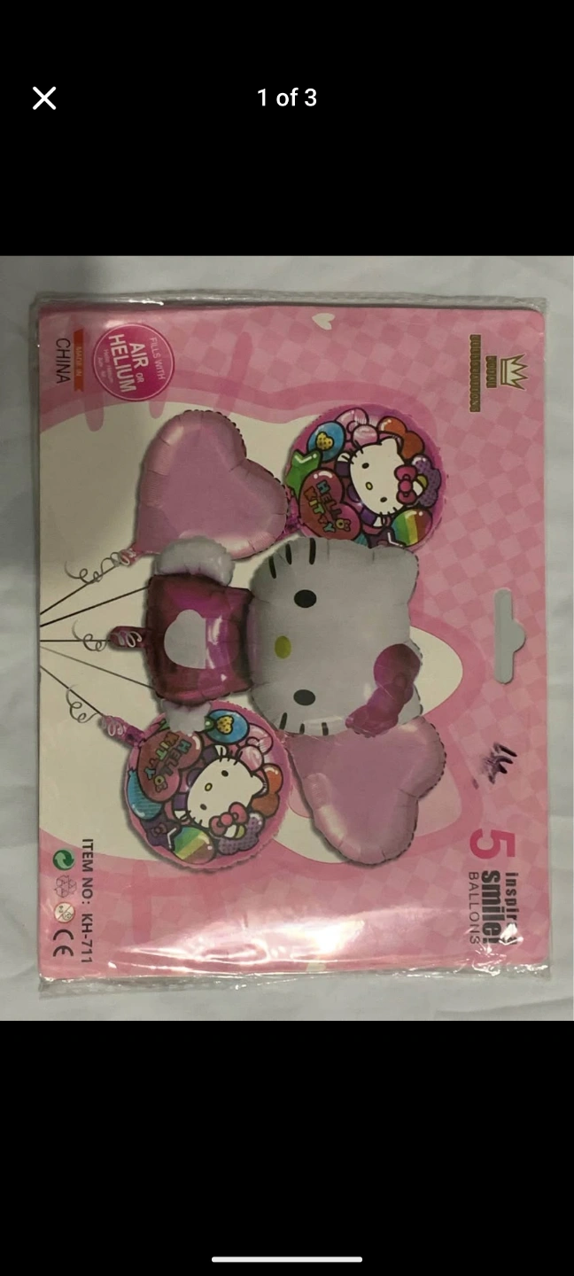 Three different five-pack balloon sets. Includes various foil balloons featuring Spiderman, Mickey Mouse and Minnie Mouse, and Hello Kitty. Perfect for birthday parties or celebrations. New, unopened packaging.