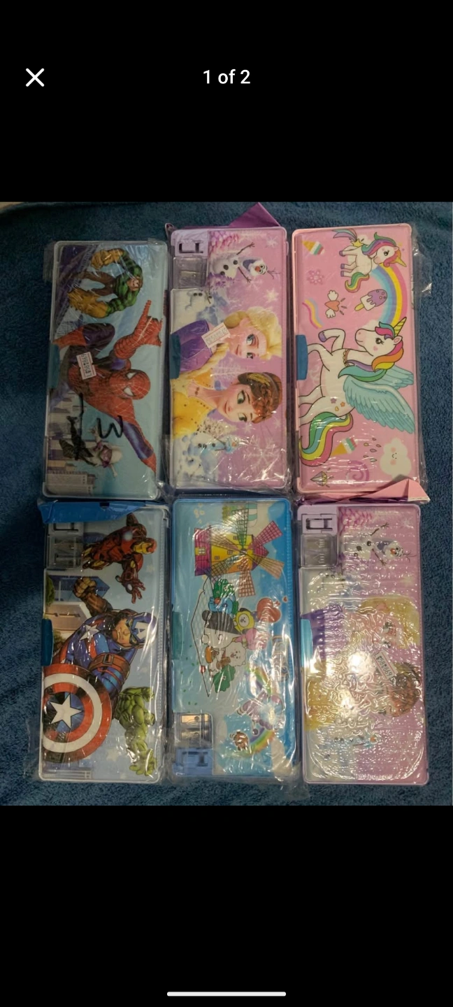 Set of six pencil cases. Various designs including Marvel characters, Frozen characters, and unicorns. Each case features multiple compartments.