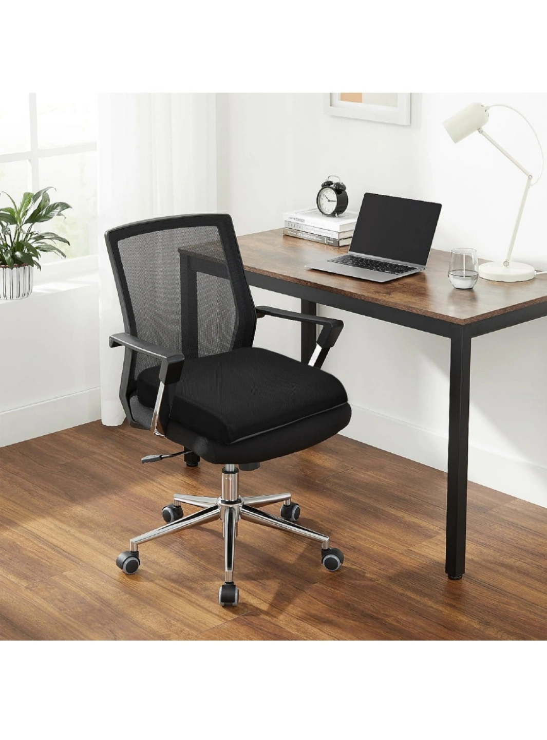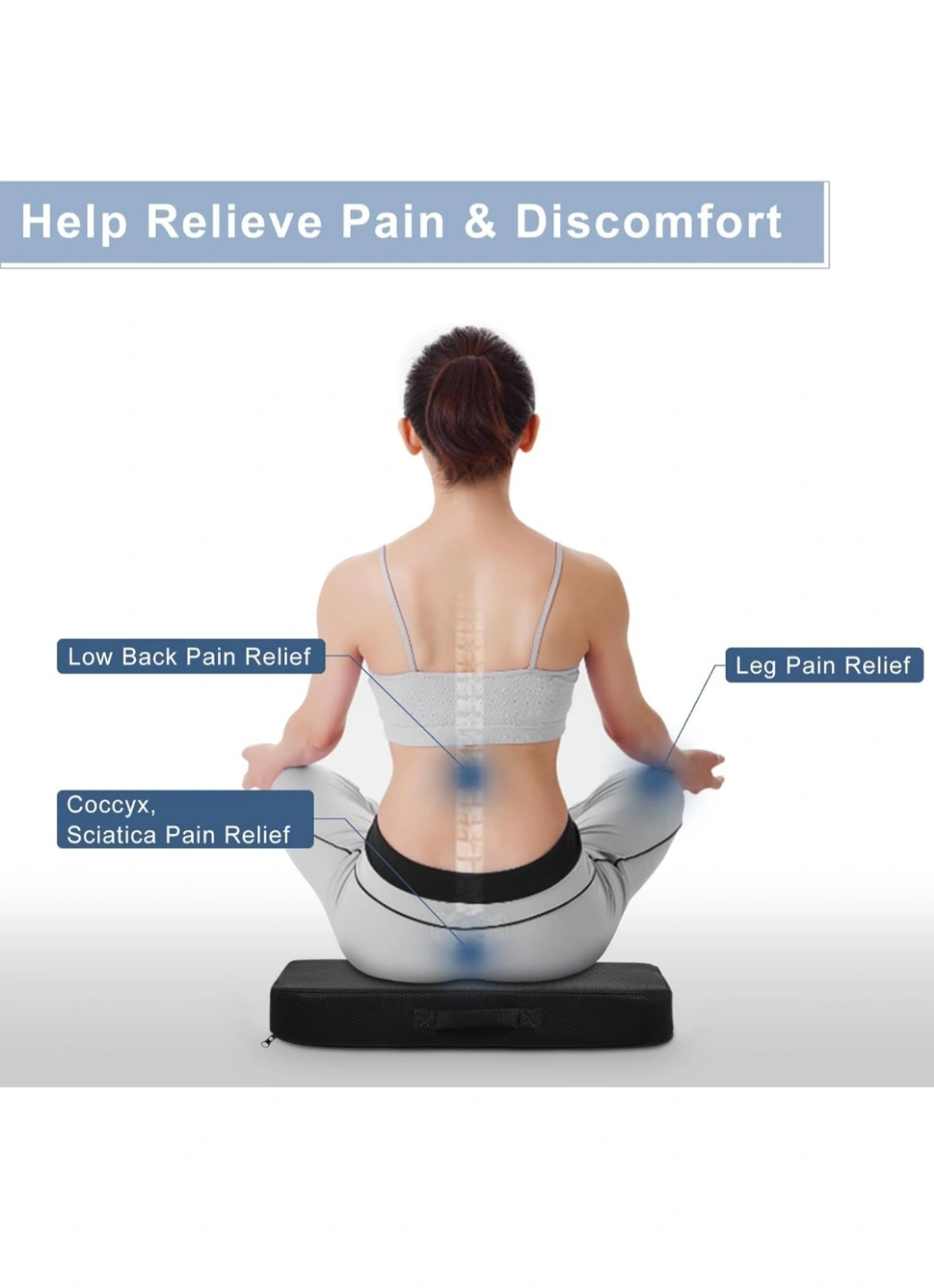 16Memory foam and high-density foam seat cushion. Washable mesh cover. Features a handle and zipper. Relieves pain and discomfort. Measures approximately 17" x 19" x 3".