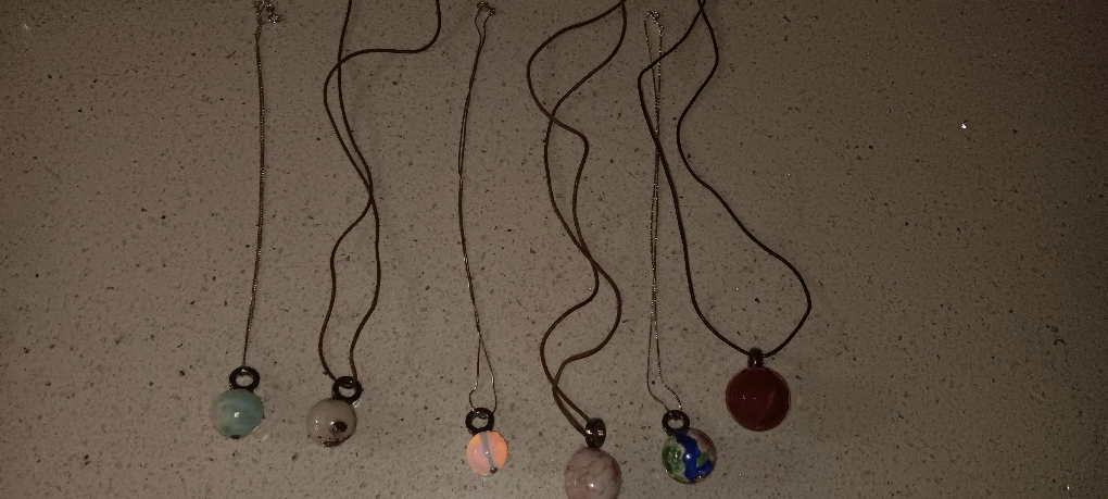 Set of five necklaces. Assorted pendants. Variety of colors and materials. sterling silver chains. some cords. 15-20$ each