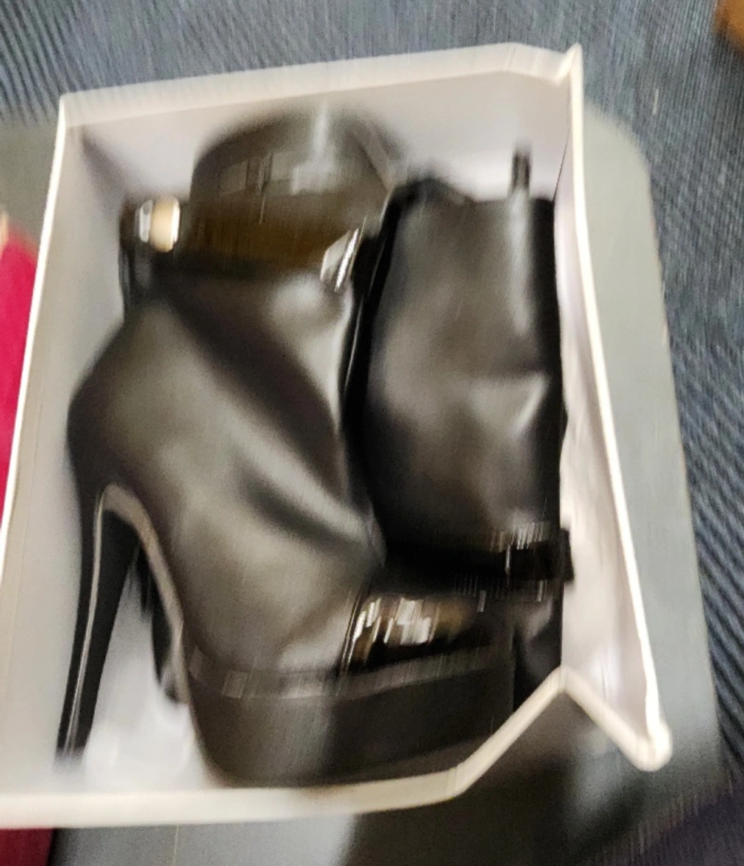 739Stylish black boots. Platform heels. Slight sheen. Zipper closure. Excellent condition.