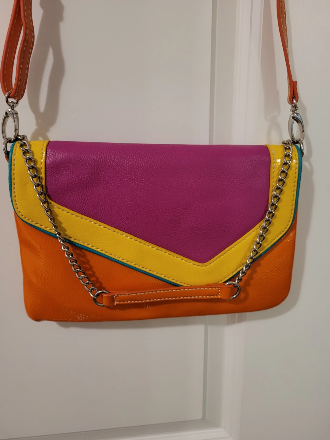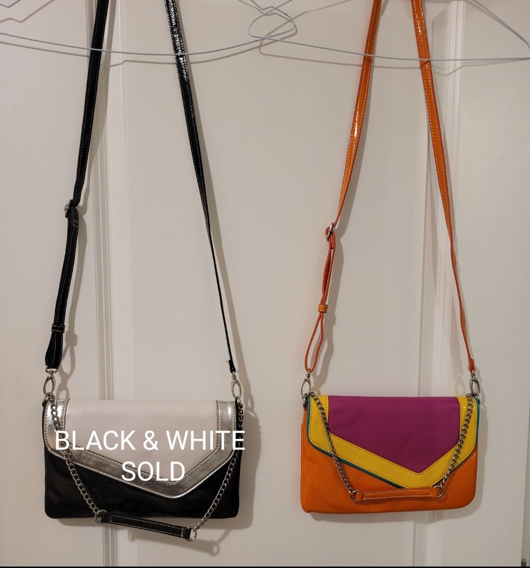 THE BLACK BAG SOLD Nine West crossbody bags. one orange, yellow, and pink. feature chain straps and flap closures.