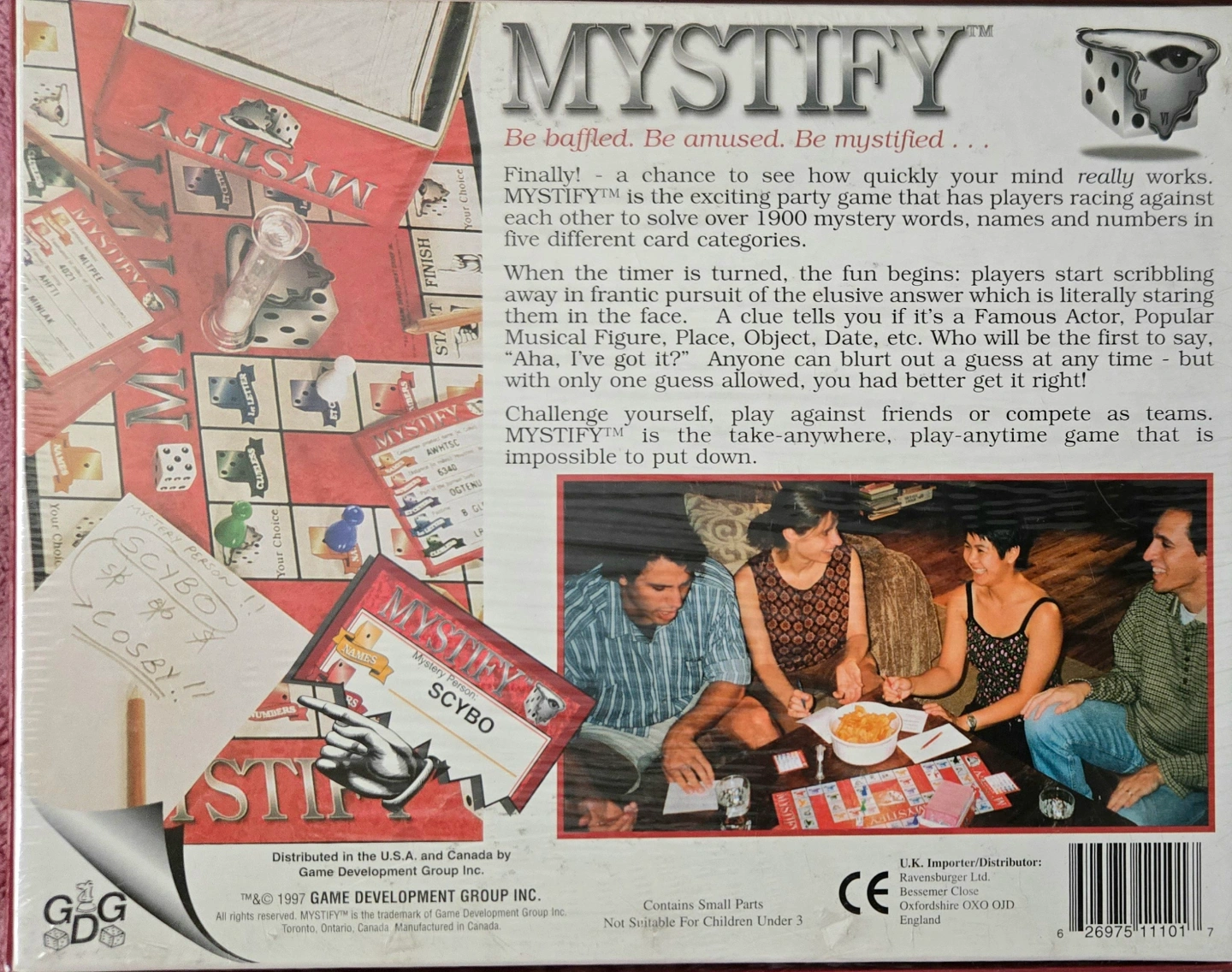 New, unopened box of the Mystify party game. Players race against each other to solve over 1900 mystery words, names and numbers in five different categories. Fun for all ages. Take-anywhere game.