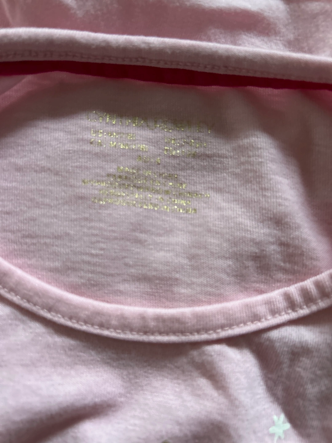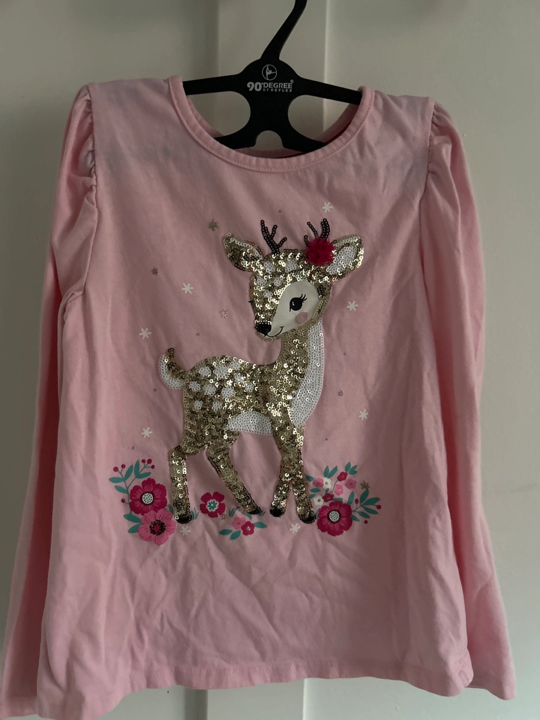 Adorable pink long-sleeved shirt. Features a sparkly gold reindeer design with floral accents. Size 7/8. Great for the holiday season.