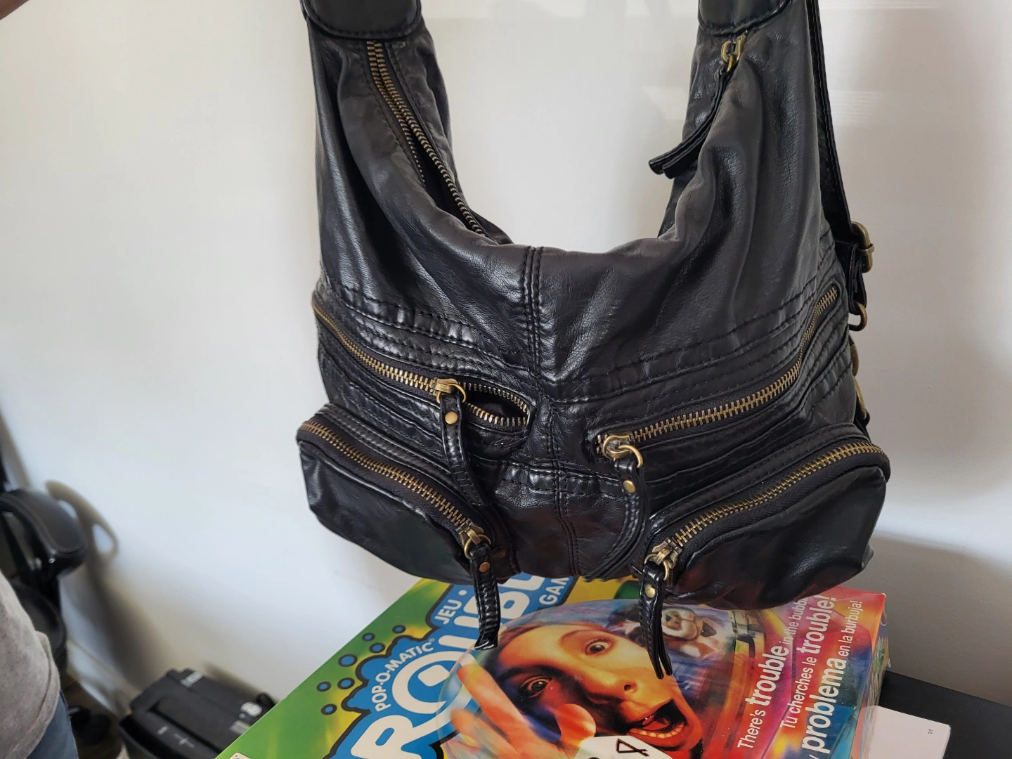 Large black faux leather handbag. Multiple zippered compartments. Convertible straps; can be worn as a shoulder bag or backpack. Good condition.