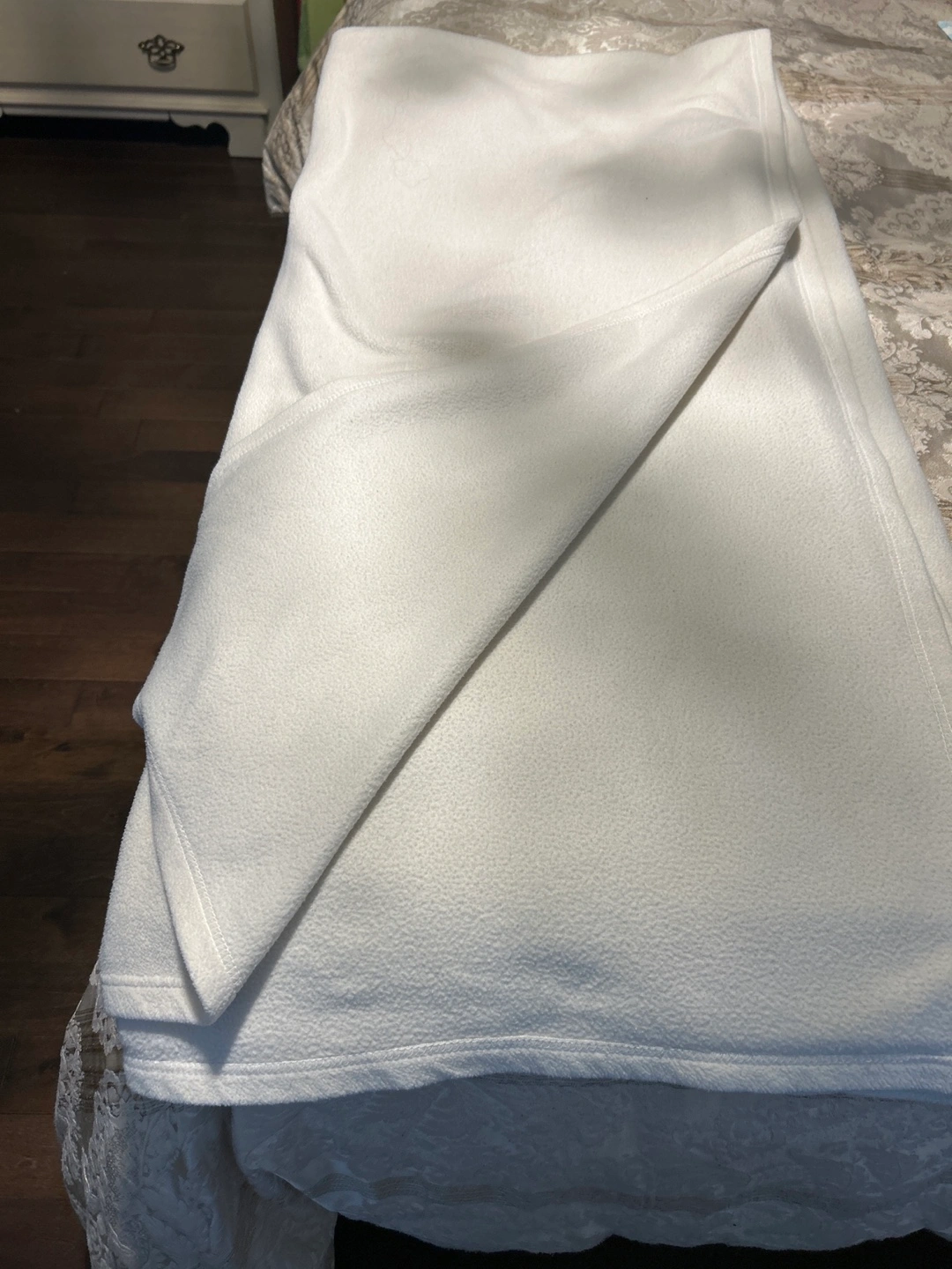 Soft, cozy fleece blanket. Great for snuggling up on the couch or bed. Off-white colour. Machine washable.