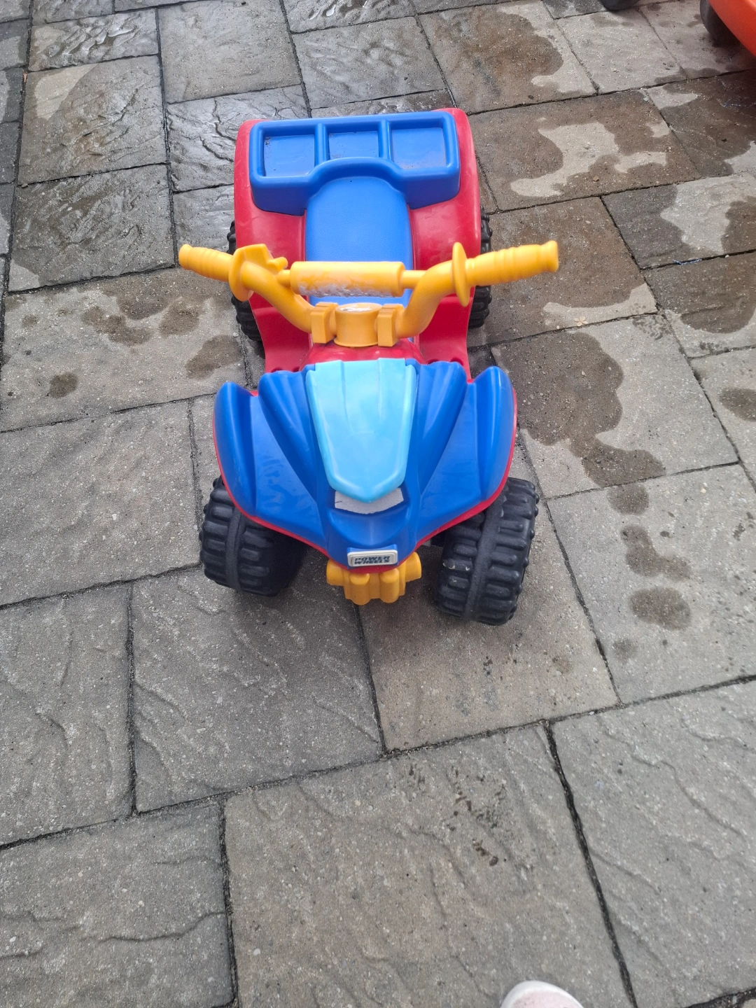 18Fun toy for your little one. Red, blue and yellow plastic. Four wheels. Footrests. Suitable for toddlers and preschoolers.
