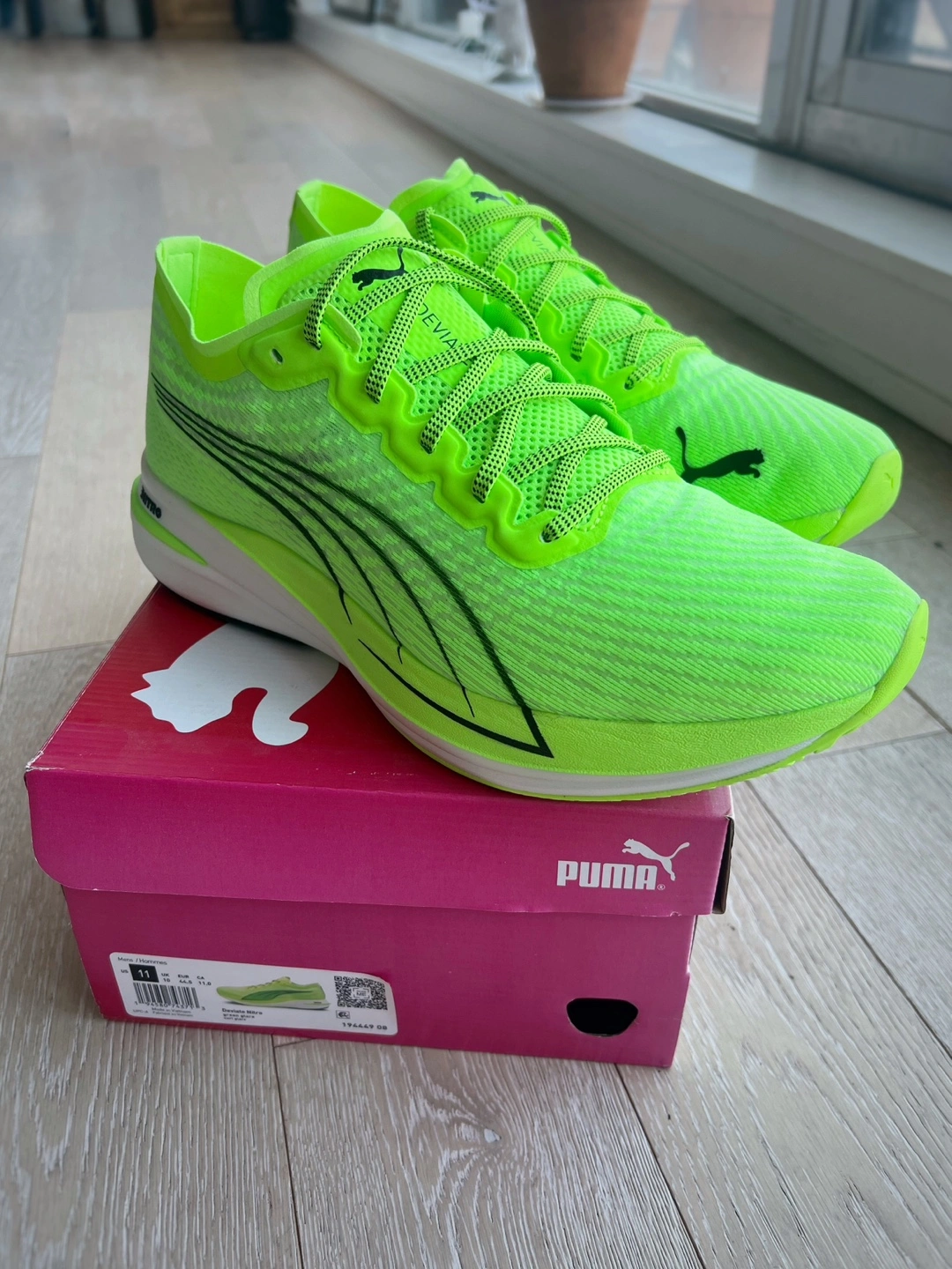 Bright neon green running shoes. Lightweight design. Never been used, comes in original Puma box. Size 11.