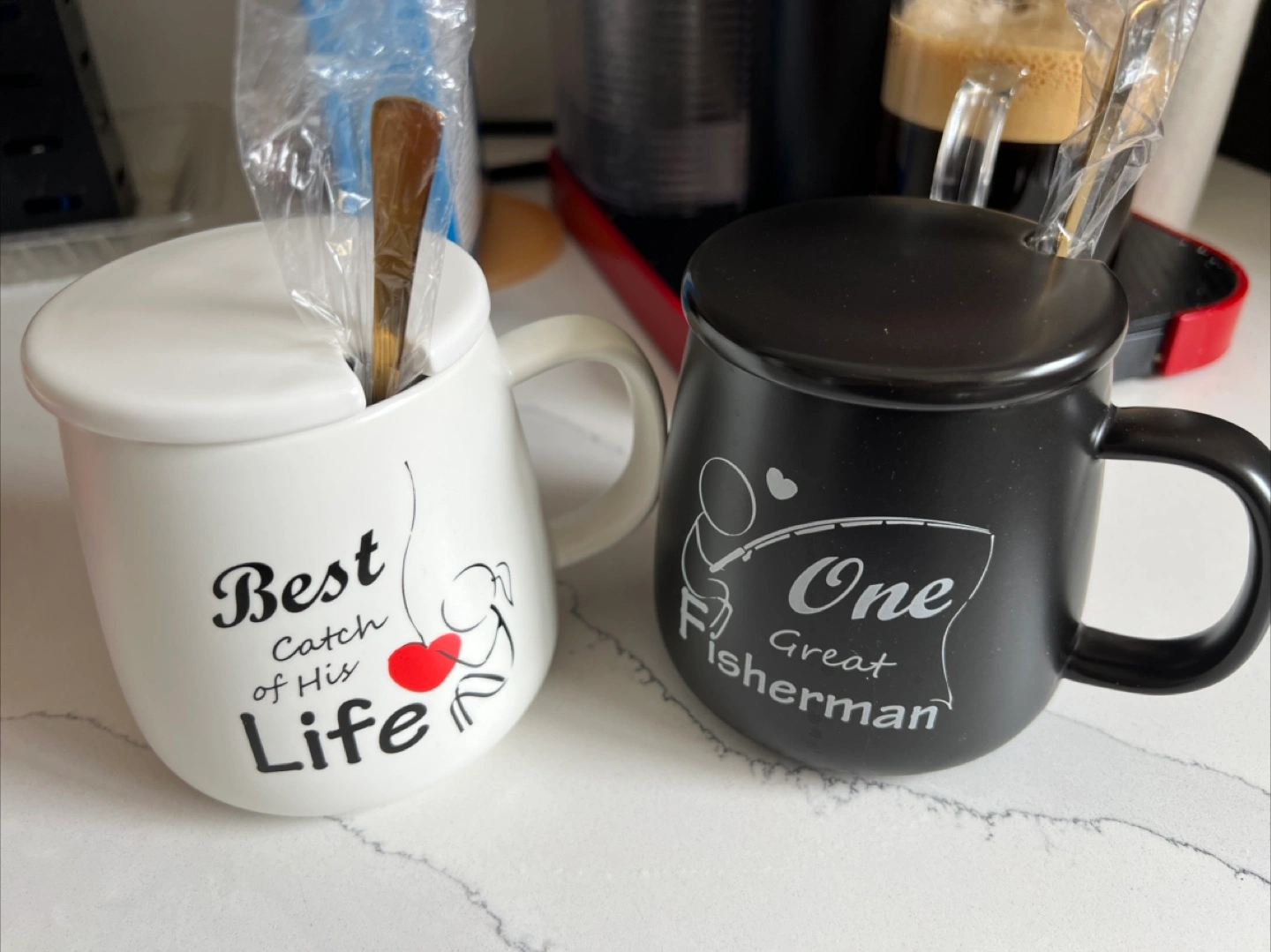 Set of two ceramic mugs. One white mug says "Best Catch of His Life." One black mug says "One Great Fisherman." Each mug includes a lid and a small spoon. Perfect gift for a couple.