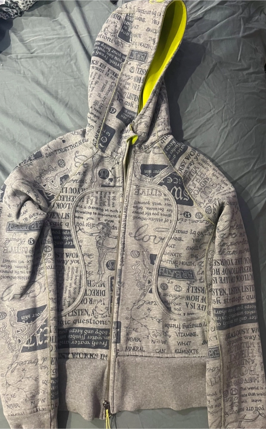 Grey zip-up hoodie. Features a neon yellow hood lining and all-over print. Lululemon logo throughout.
