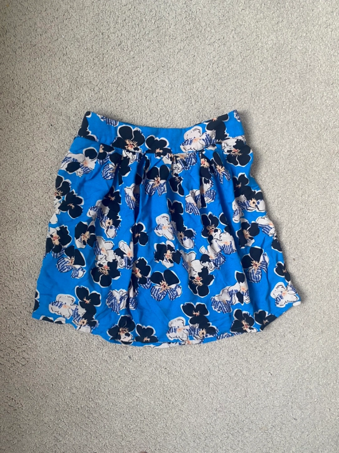 Bundle includes two skirts. One teal maxi skirt, asymmetrical design. One blue mini skirt, floral print. Both appear to be in good condition. Size small 10$ each